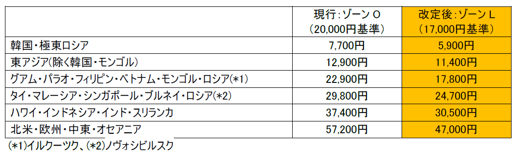 運賃額 : 日本発旅程 (金額はお一人さま一区間片道あたり)