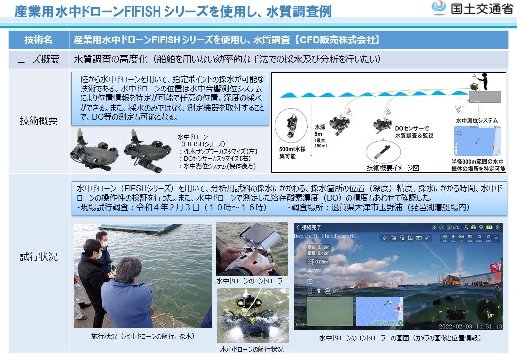 シー・エフ・デー販売株式会社(社長:三谷弘次、本社:愛知県名古屋市)は、QYSEA社の総代理店として、水中ドローン QYSEA FIFISHシリーズを用いた水質調査技術を、令和5年12月1日に国土交通省関東地方整備局よりNETISへ登録を完了しましたのでお知らせいたします。