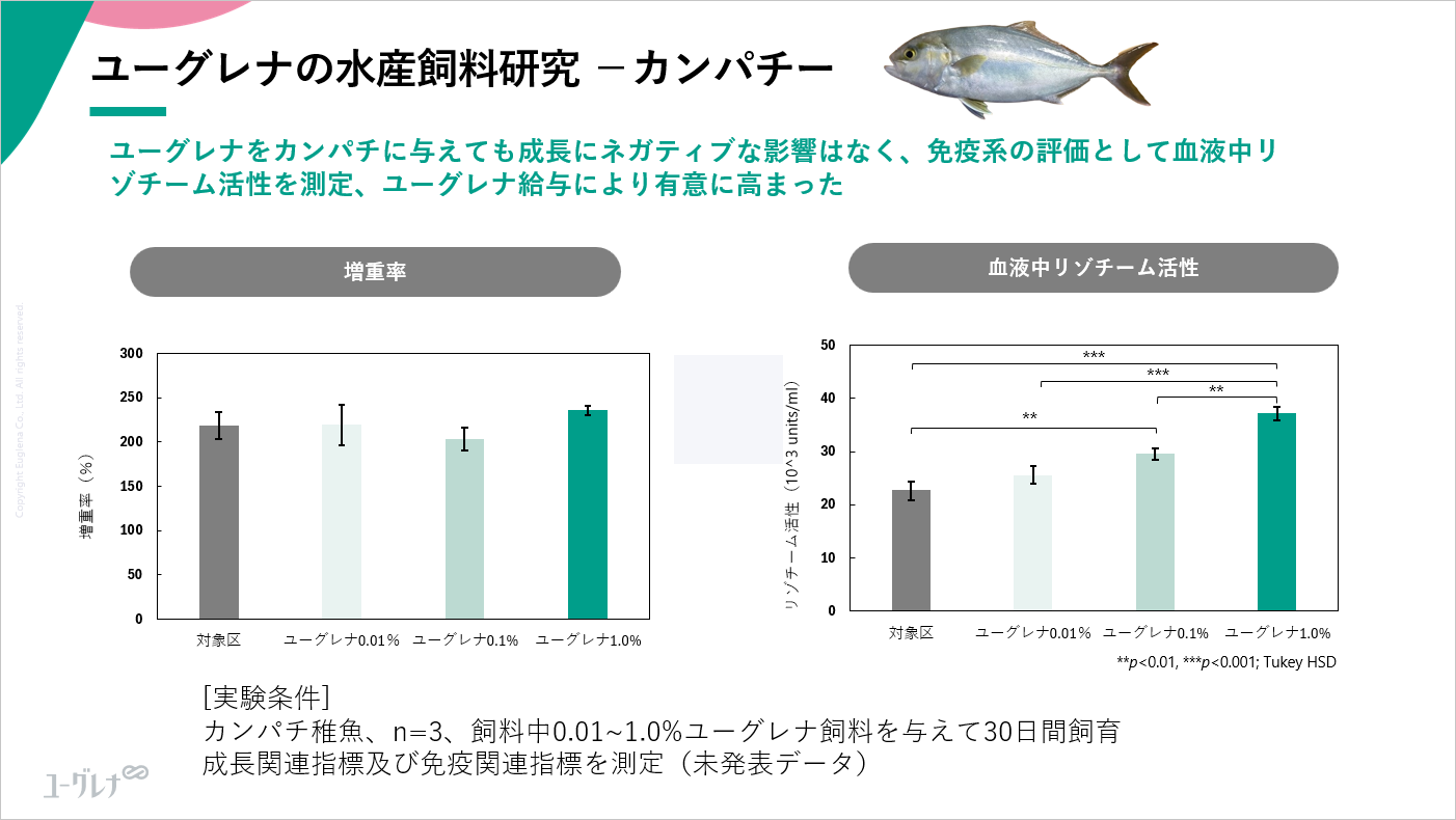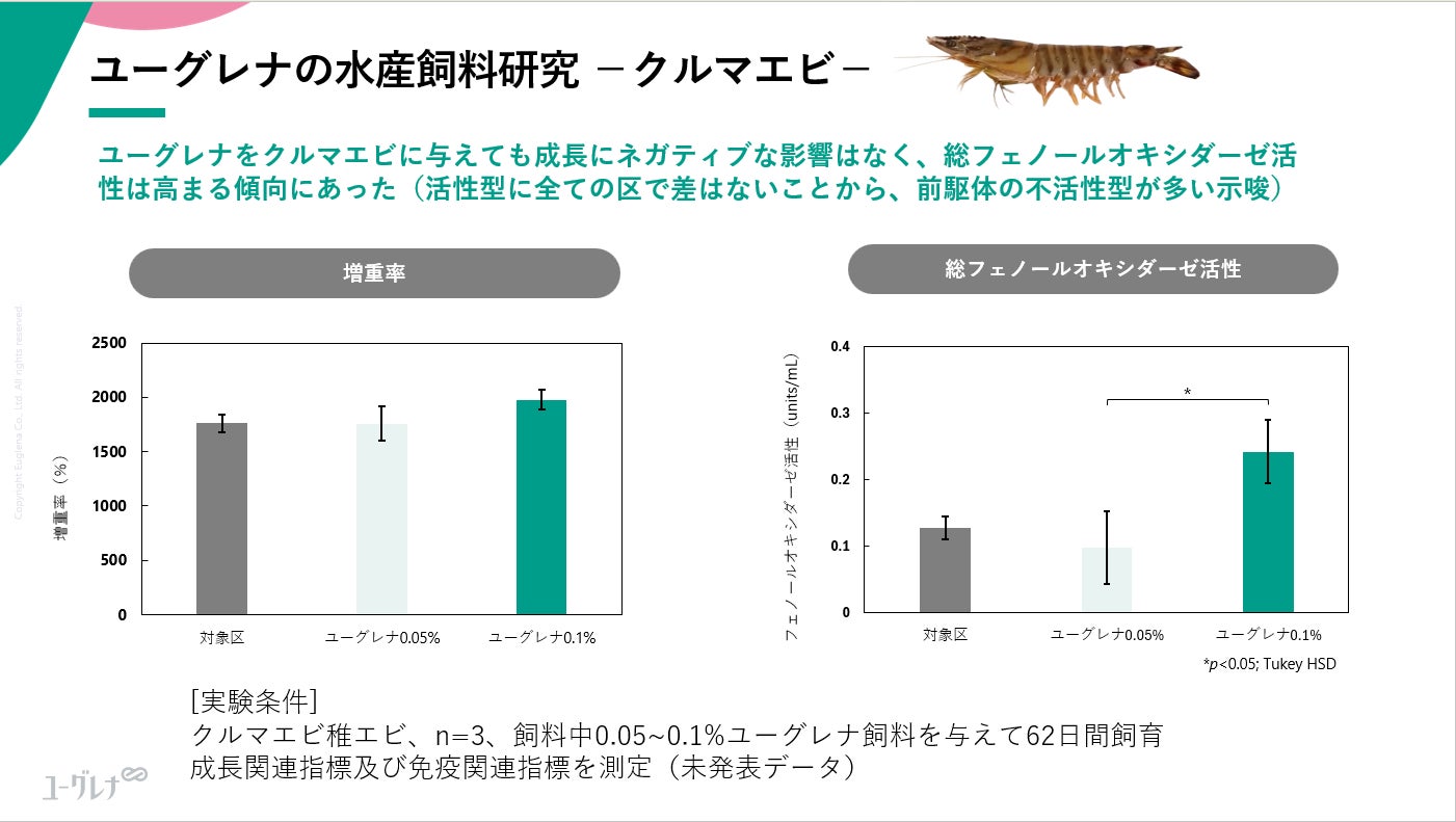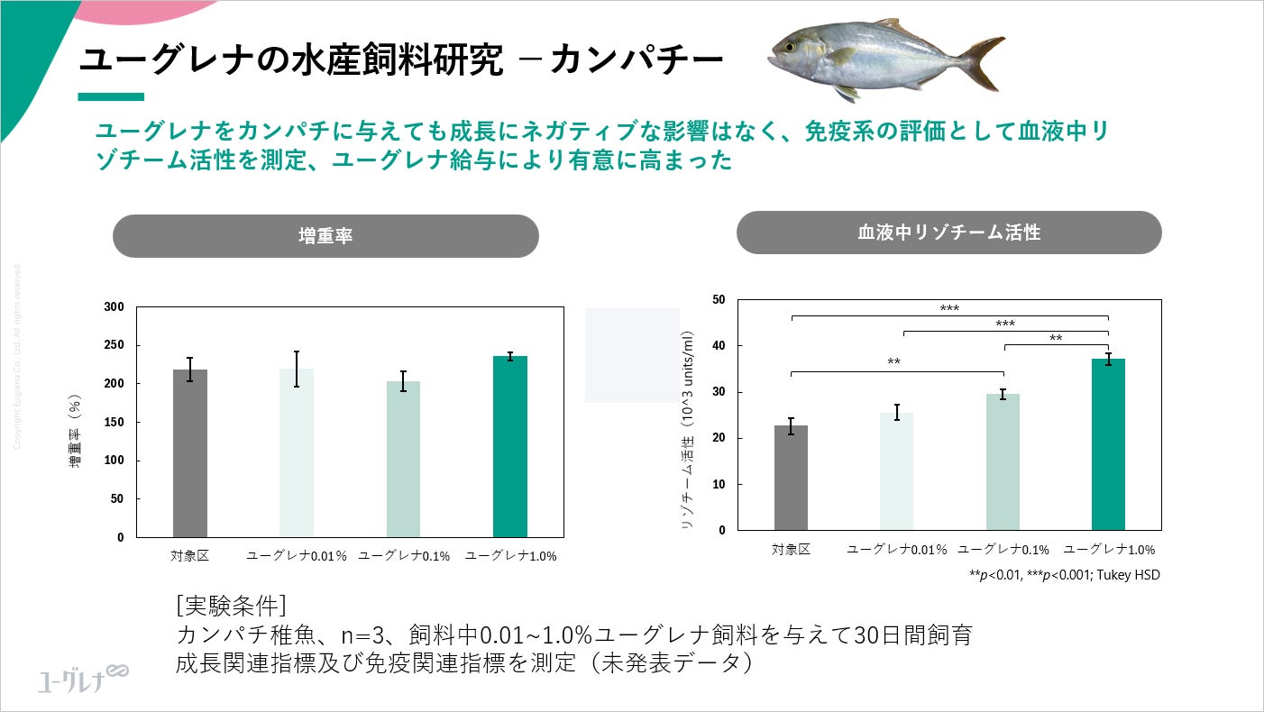 水産分野では国立大学法人鹿児島大学水産学部 (鹿児島県鹿児島市、学長:佐野輝)との共同研究として、カンパチとクルマエビにユーグレナを配合した飼料の給餌試験を実施したところ、いずれにおいても成長にネガティブな影響は認められず、カンパチでは自然免疫の指標である血液中リゾチーム活性が、クルマエビでは感染防御に関わる総フェノールオキシダーゼ活性が上昇しました。