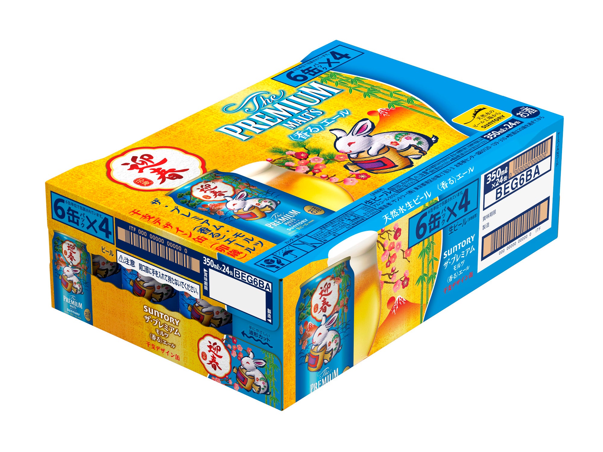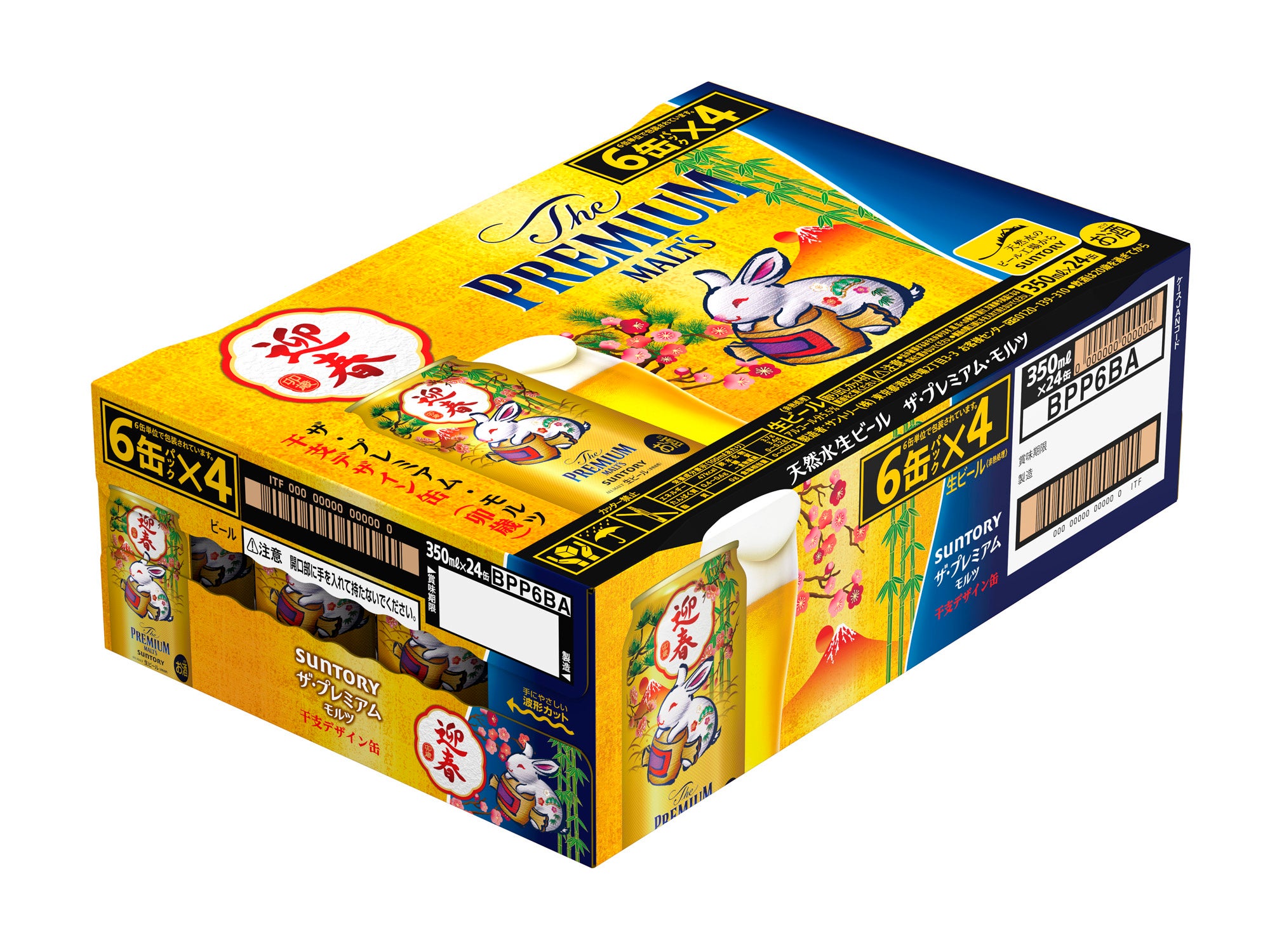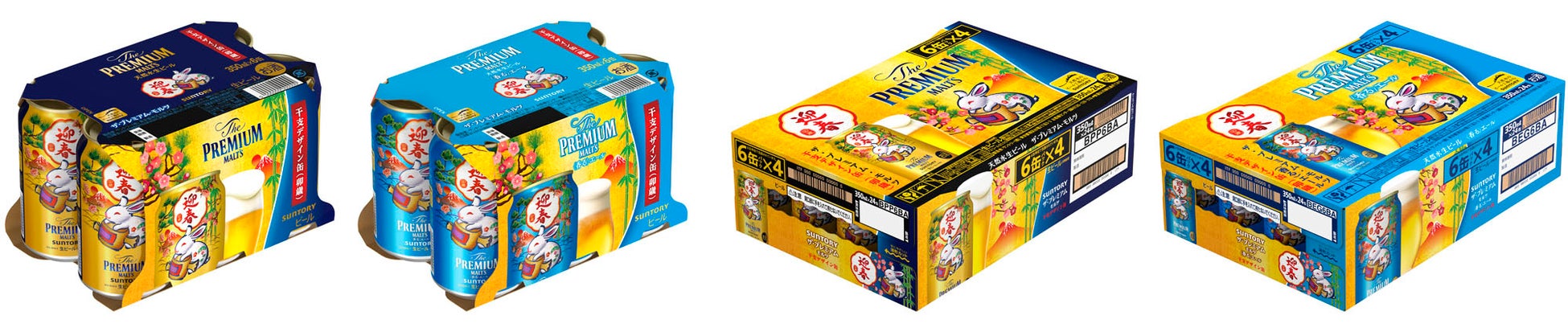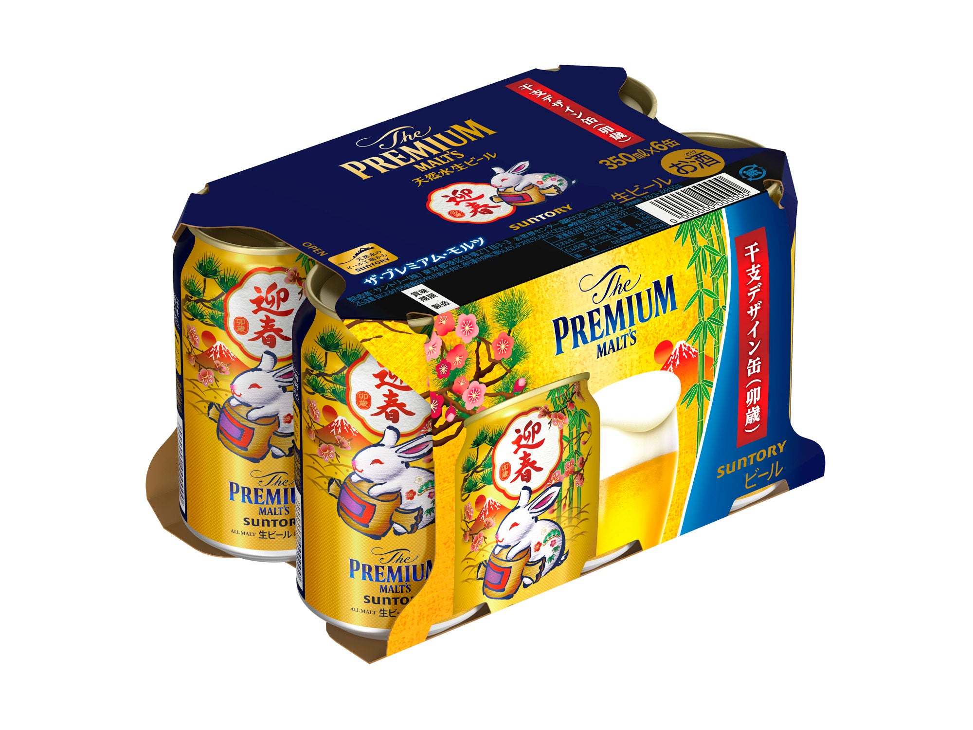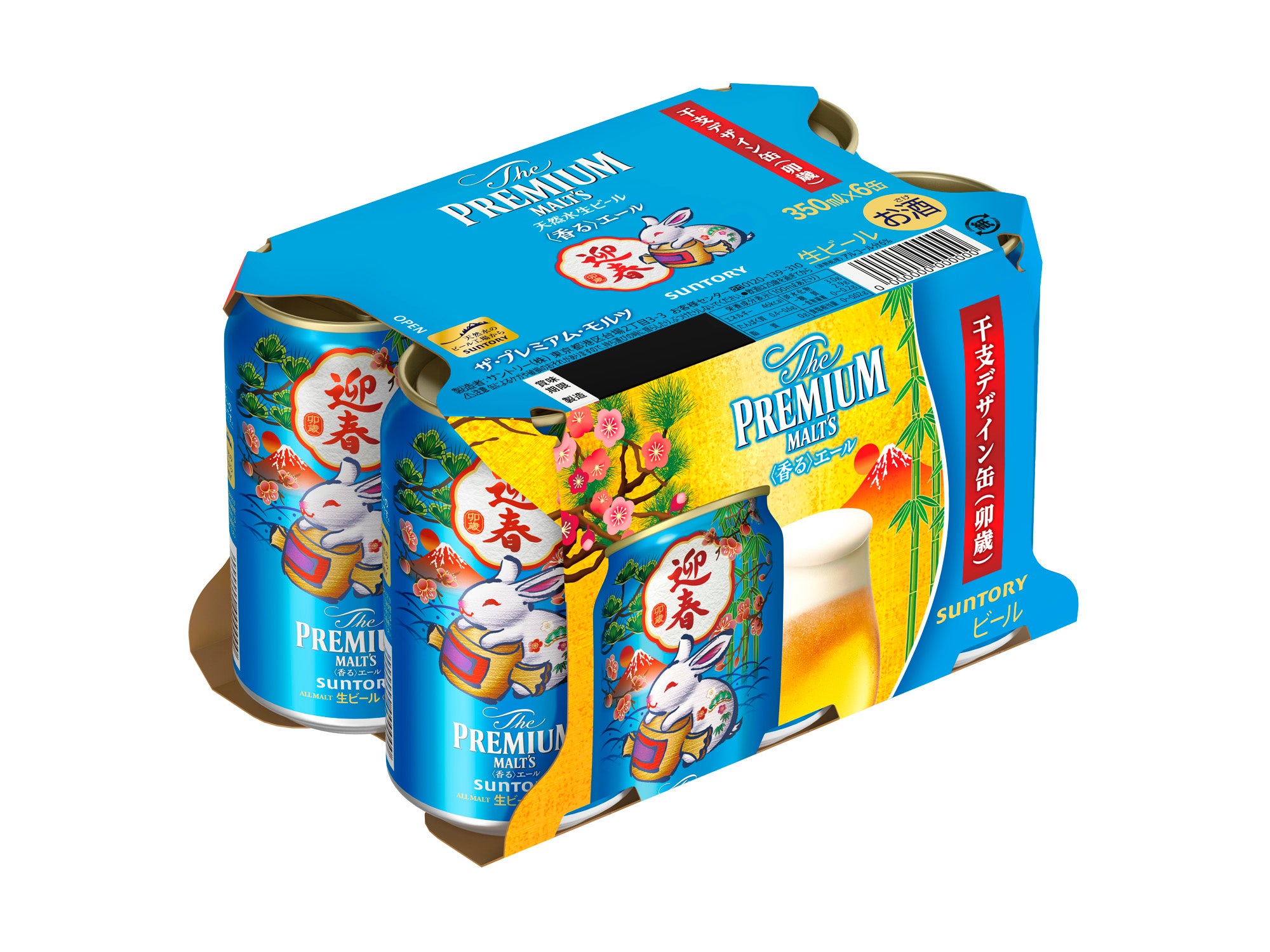 2023年の干支「卯」に加え、松竹梅や富士山といった縁起の良いモチーフをあしらった特別なデザインです。6缶パックやケースも、新しい年の始まりを華やかに彩る鮮やかなパッケージに仕上げました。また「ザ・プレミアム・モルツ〈干支デザイン缶(卯歳)〉」入りのウインターギフトセット(https://www.suntory.co.jp/news/article/14231.html参照)もご用意しました。お歳暮だけでなく、新年のご挨拶にもふさわしい商品です。