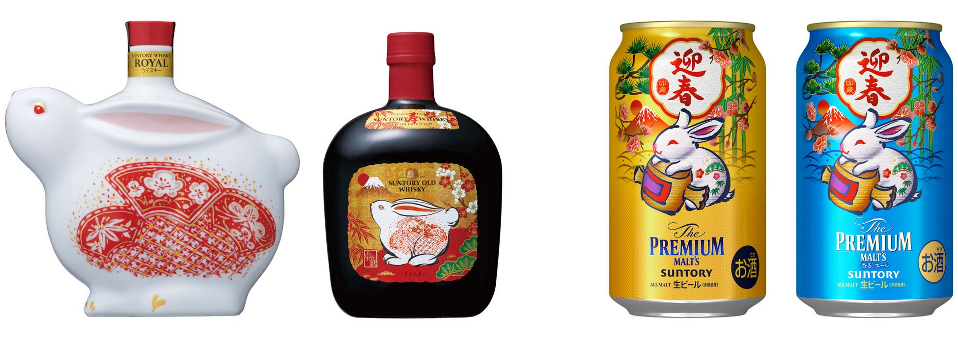 「サントリーウイスキーローヤル〈卯歳〉ボトル」は、宙に跳ねるその姿より飛躍の象徴とされ、良い知らせを伝える神獣として尊ばれてきたうさぎの姿をモチーフにしました。皆様にとって多くの吉報が届き、大きな飛躍の年になるようとの思いを込めて、縁起の良いデザインに仕上げました。