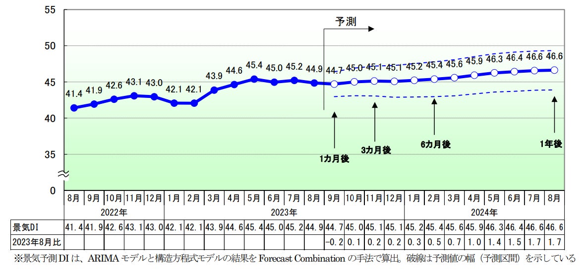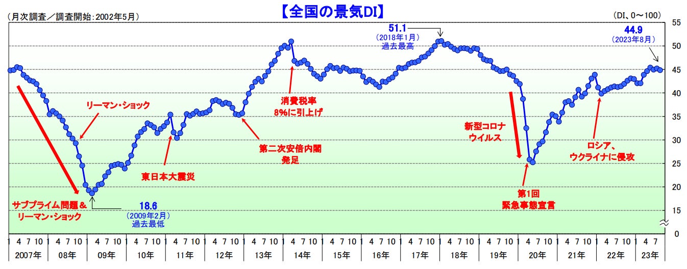2023年8月の景気DIは前月比0.3ポイント減の44.9となり、2カ月ぶりに悪化した。景気は、ガソリンを含むエネルギー価格の上昇や台風上陸による人流・物流の停滞などもあり、小幅なマイナスとなった。