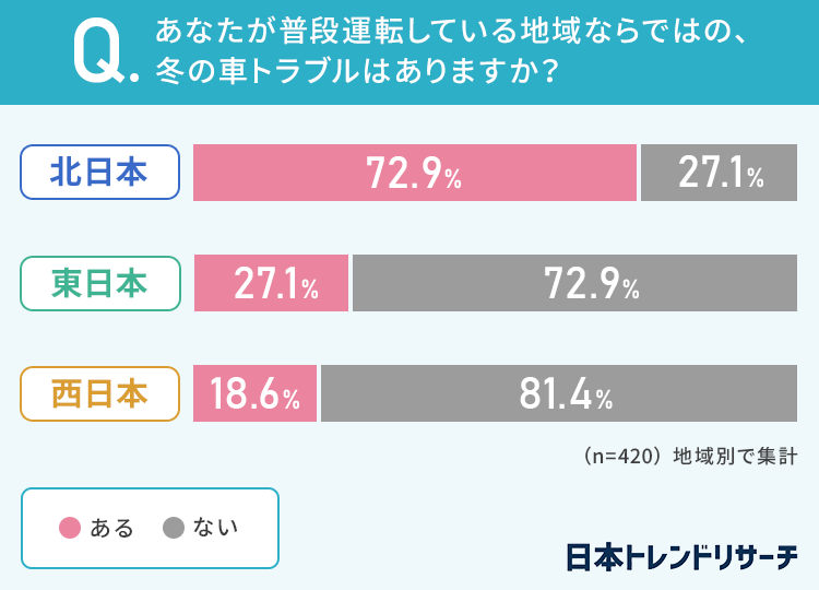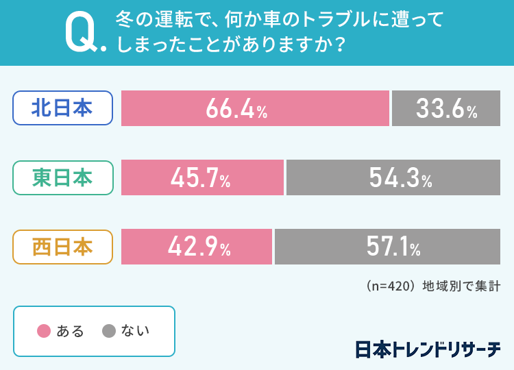 やはり「北日本」の方が66.4%ともっとも多い結果になりましたが、「東日本」「西日本」の方も4割以上が冬の運転でトラブルに遭ってしまったことがあるようです。