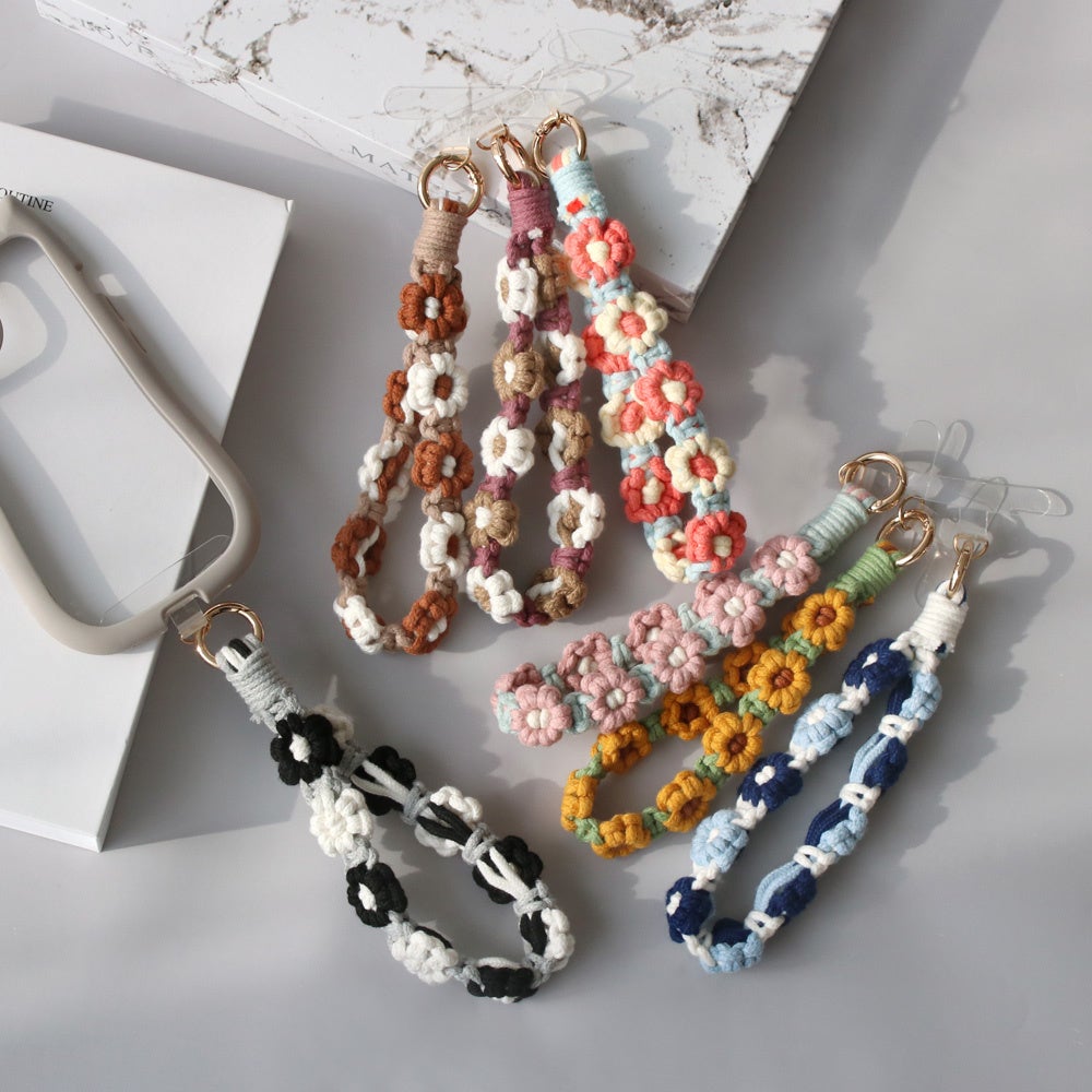 手編み風の温かみあるデザインに、カラフルなお花モチーフがポイントのスマホストラップ。