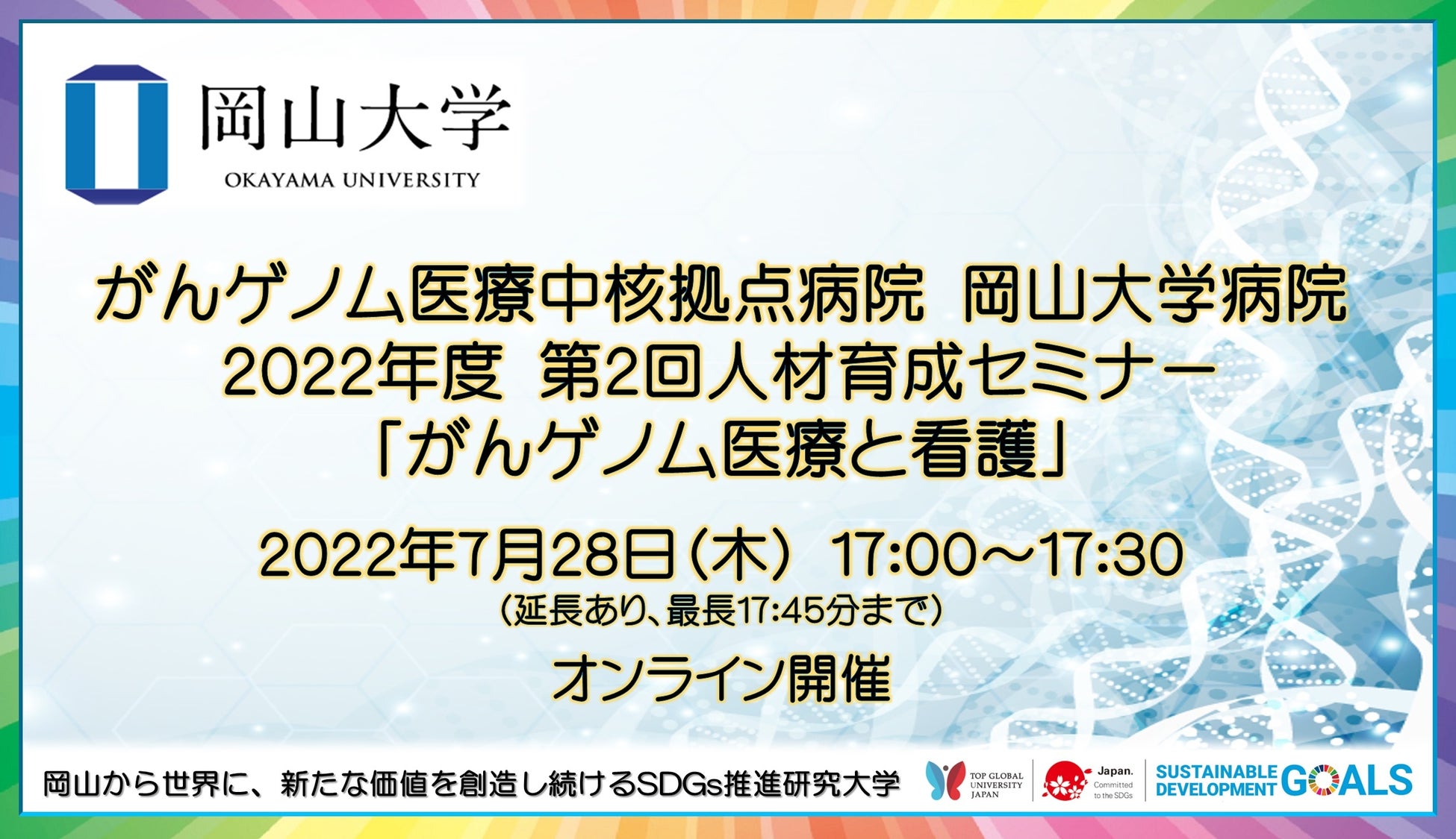 【岡山大学】がんゲノム医療中核拠点病院 岡山大学病院 2022年度第2回人材育成セミナー「がんゲノム医療と看護 オンライン事例検討会」〔7/28,木〕