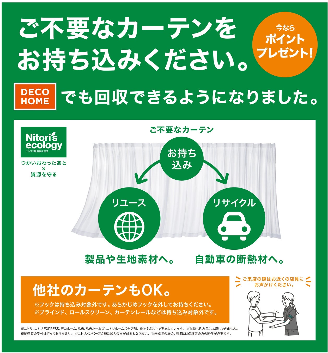 【ニトリのカーテン回収】7月8日より期間限定でニトリポイントプレゼント!全国174店舗の「デコホーム」でも常時受付スタート!回収対象店舗が拡大します。