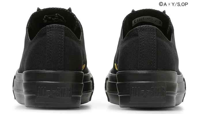 バックステージで「B小町」を支えるスタッフにふさわしい、汚れが目立ちにくいブラックのオールスターを採用。タン裏には名前を書き込める、「B小町」のライブ用バックパスをイメージしたデザインをプリント。かかとには「苺プロダクション」スタッフを示すクレジットをあしらい、BOXもスタッフ用として苺プロに納品される黒い特別デザインで統一。さらに、「B小町」の3人を推すサイリウムをイメージしたスペアシューレースを付属。