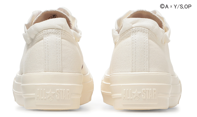 厚底仕様の「ALL STAR LIGHT PLTS」をベースに、リボンやフリル、ファットレース、黒×黄の配色など、各メンバーの個性を象徴するデザインを採用しました。全モデル共通で、TVアニメ『【推しの子】』を象徴する星モチーフの特別タンラベルを配置し、インソールには「B小町」×「コンバース」のコラボレーションロゴ、タン裏には各キャラクターのサインをプリント。さらに、シューズ内部には公式衣装を示す苺プロダクションのクレジットを施しました。