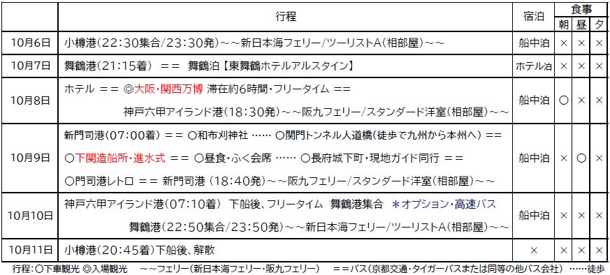 新日本海フェリー往復乗船代(基本:ツーリストA)・阪九フェリー往復乗船代(基本:スタンダード洋室)・食事代(朝1回・昼1回)・ホテル宿泊代(1泊)・バス代(2~4日目)・「大阪・関西万博」1日券・消費税等諸税