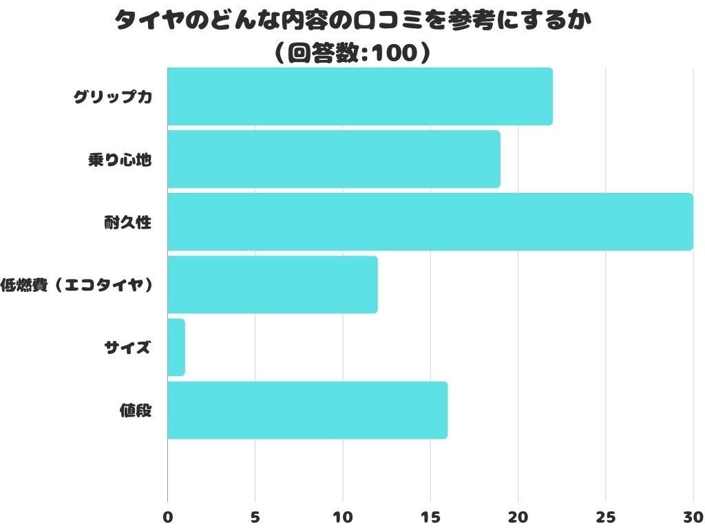 タイヤのどんな内容の口コミを参考にするをアンケートにて調査したところ、1位は「耐久性」でした。