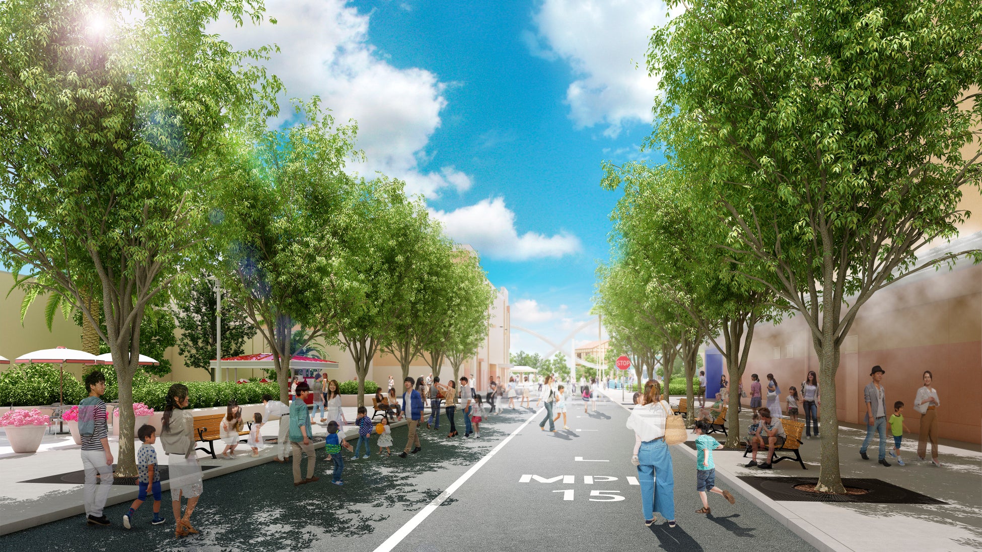 ハリウッド・エリアに、緑が美しい並木道Greene Street(グリーン・ストリート)が誕生。暑い日差しを遮ってくれる樹木を植樹し、ゲストの皆さまが木陰で一息つける憩いの並木道となります。