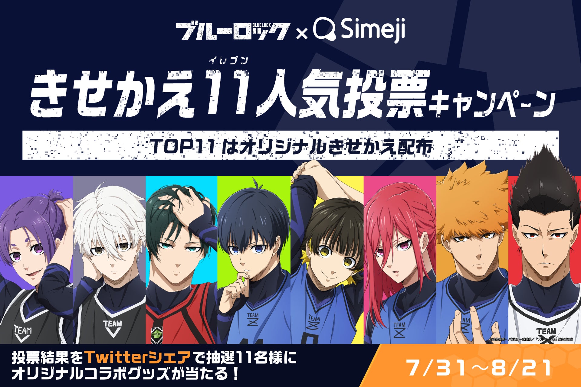 Simeji主催でブルーロックの人気キャラクターTOP11を決める投票キャンペーンを実施いたします。そして、TOP11にランクインしたキャラクターのオリジナルグッズやSimejiきせかえが登場!総勢24名のキャラクターの中から推しを選んで応援してね!