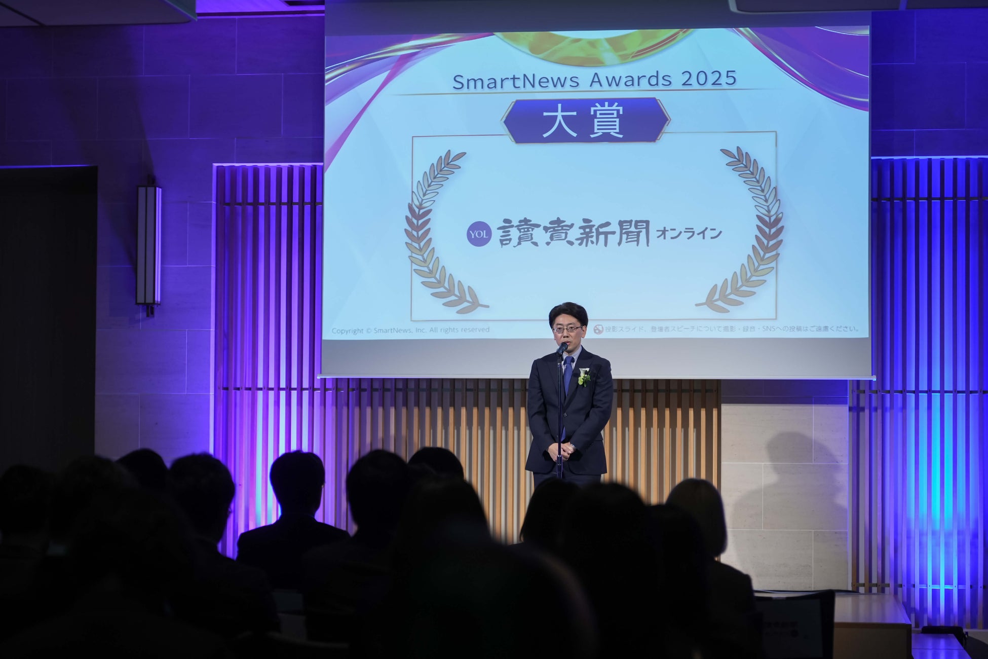 続いて、良質なコンテンツの担い手であるメディアを顕彰する「SmartNews Awards 2025」の授賞式が執り行われ、良質な情報を届けてくださったパートナーの皆様の多大なる尽力に、改めて感謝と敬意を表する場となりました。浜本より、ベストパートナー賞を受賞された10媒体へ花束が贈呈され、続いて大賞に輝いた「読売新聞オンライン」が表彰されました。