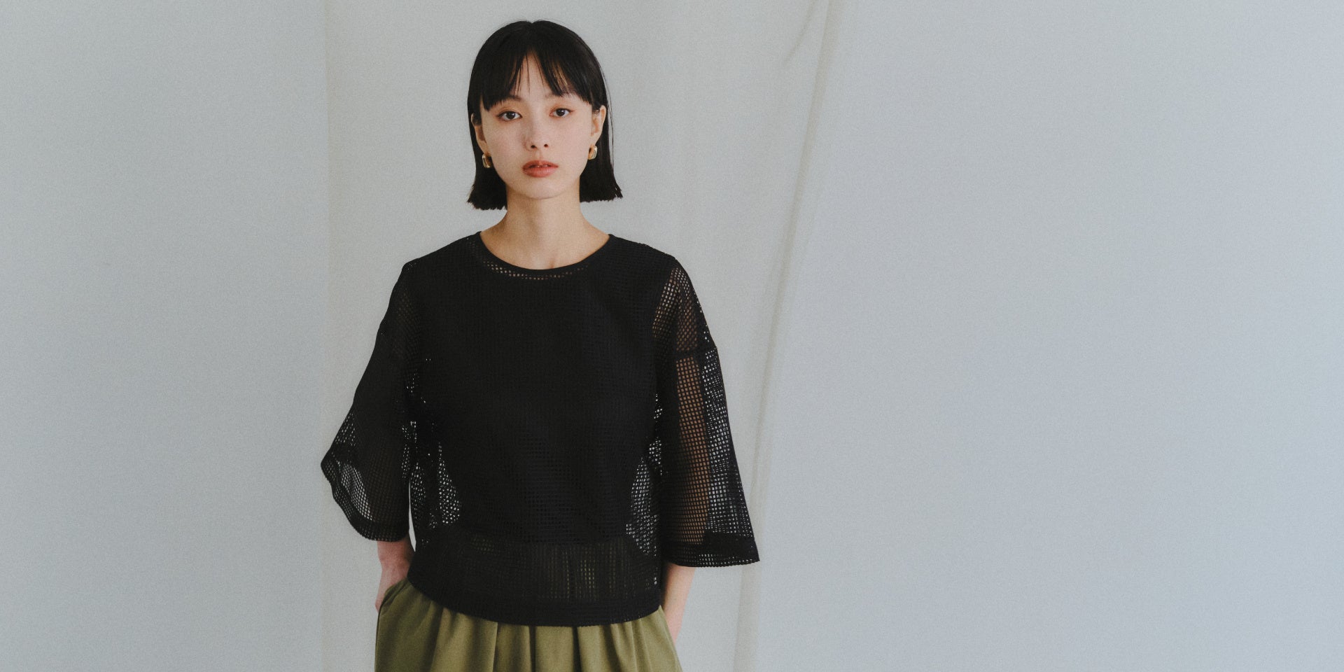 細かい格子柄による程よい透け感とシンプルなデザインで、涼し気な印象です。上下セットでも単品でも着回しやすいアイテムです。