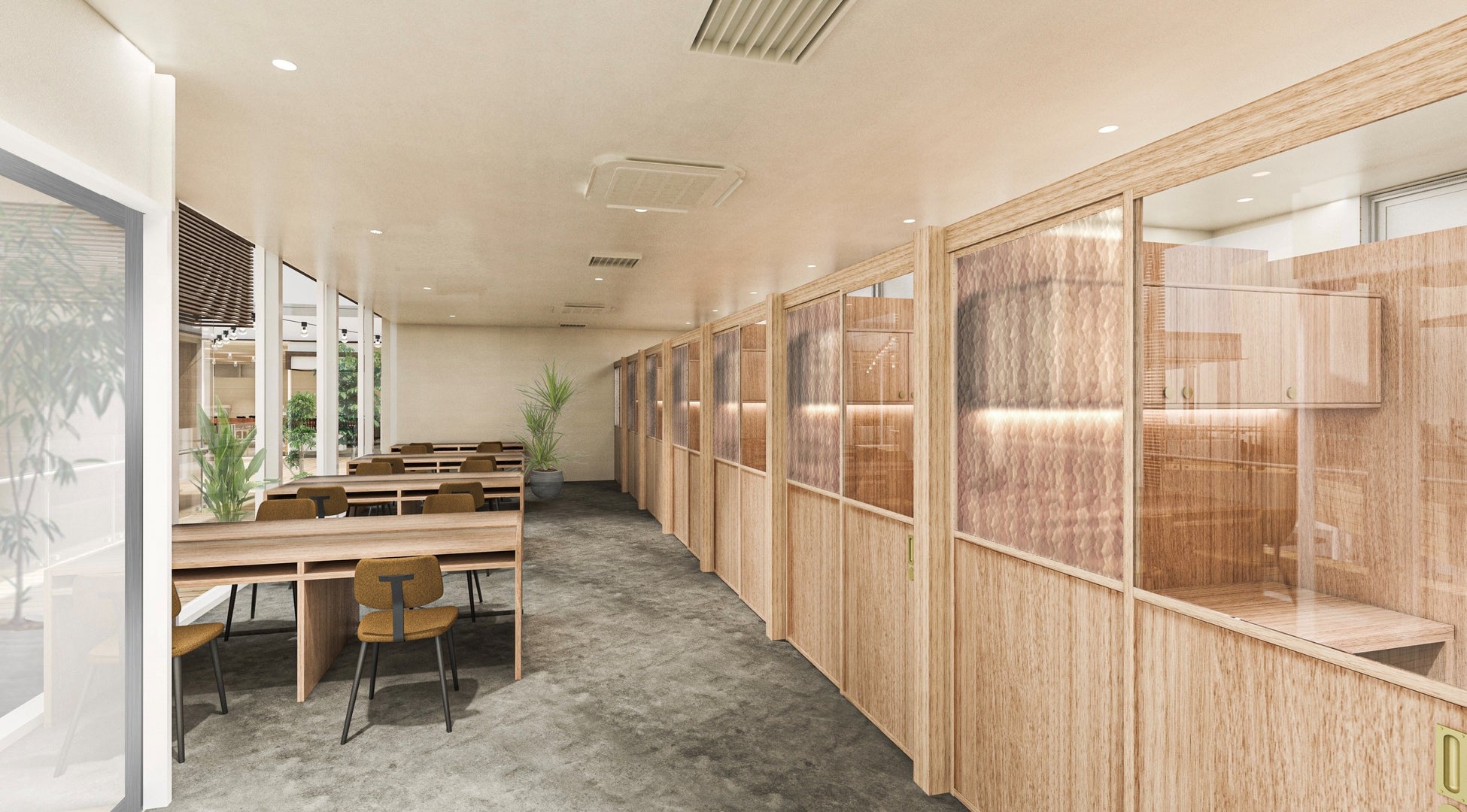 2階部分には、UDS株式会社が企画・設計・運営する、ラウンジ、カフェ、オフィス、レンタルスタジオを併設する「(tefu)jiyugaoka」が開業します。ラウンジ、オフィスでは個人向けに、ドロップインや個室ブース利用など用途に応じて柔軟に選択できるさまざまなプランを提供します。また、自由が丘で過ごす学生、親子、シニア層などの幅広い世代が気軽に立ち寄れ、仕事、勉強、読書など、思い思いの形で利用できる、まちに開かれた居場所を目指します。