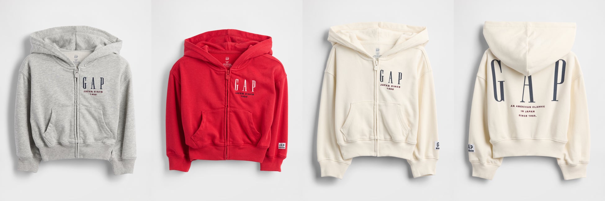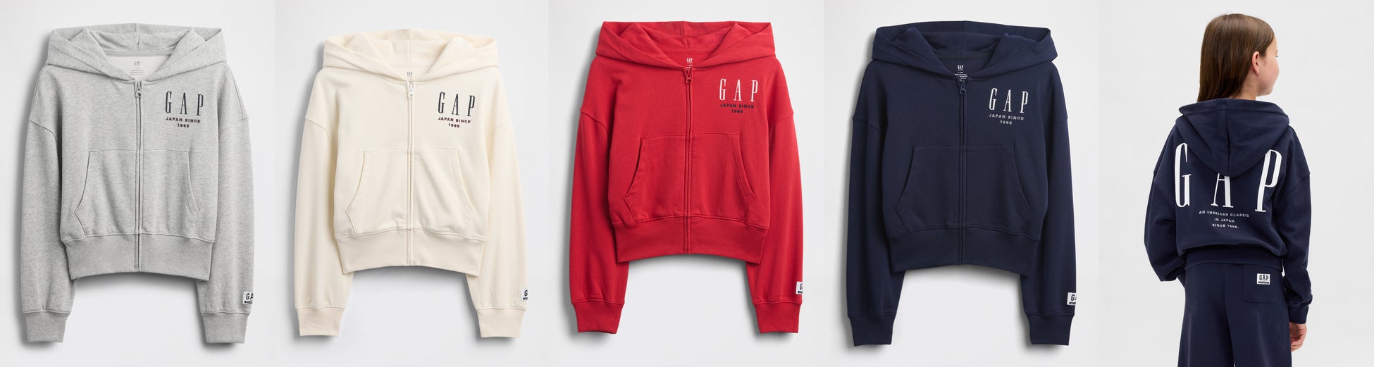 メンズ・キッズボーイズはオーバーサイズで着こなせるジップアップフーディーとスウェットパンツのセットアップ、ウィメンズ・キッズガールズはクロップド丈のジップアップフーディーにスウェットパンツのセットアップ、トドラーはジップアップフーディー、ニューボーンはカバーオールがラインナップします。GAPロゴや「AN AMERICAN CLASSIC IN JAPAN SINCE 1995」がデザインされた日本限定スウェットは、価格帯が4,990~12,900円(税込み)で、家族や友達とリンクコーデが楽しめるコレクションとなっています。