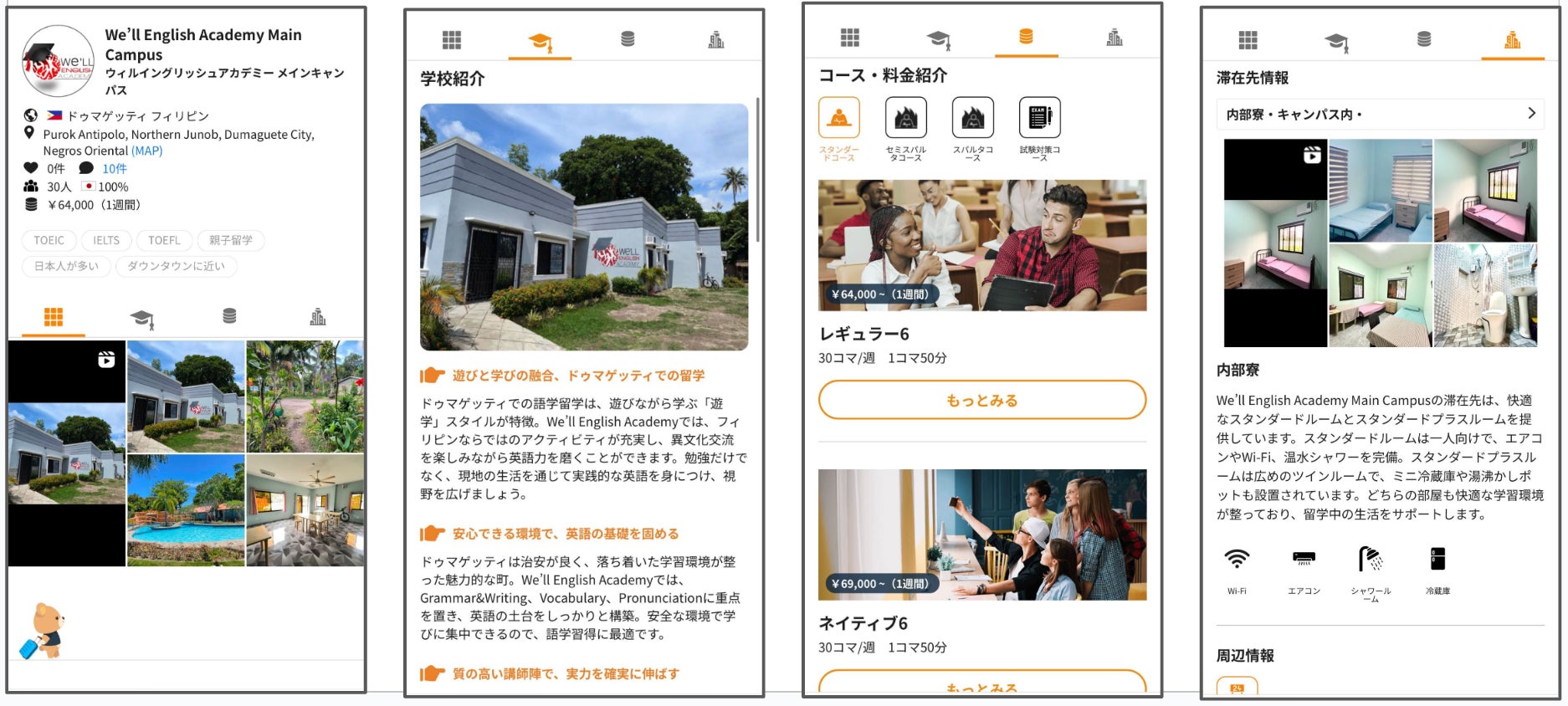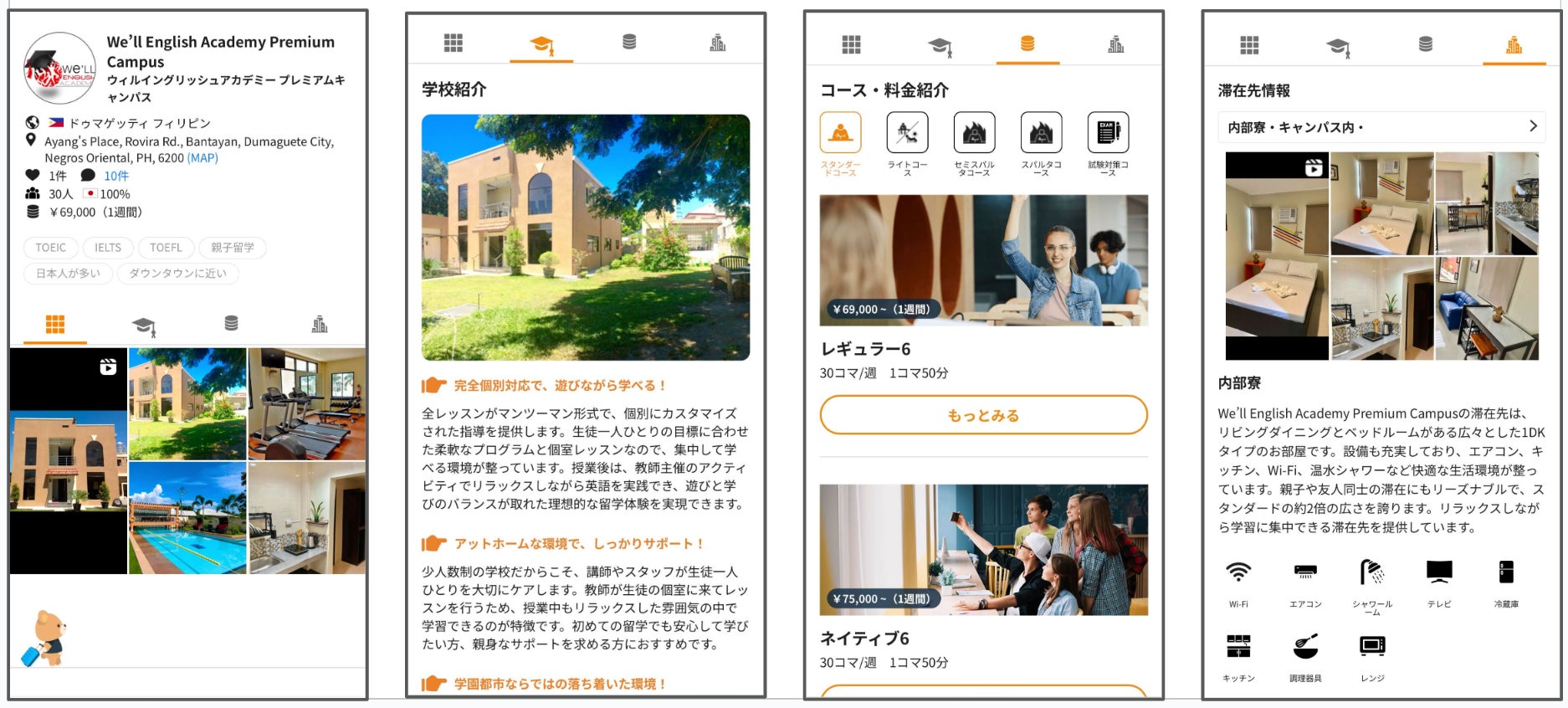 ネイティブキャンプ留学では、ユーザーが必要な情報を分かりやすく把握できるよう、常に丁寧で明確な情報提供を心がけています。We’ll English Academyの詳細情報は、以下の4つのカテゴリーに分けて掲載しており、知りたい情報を的確にお届けします。