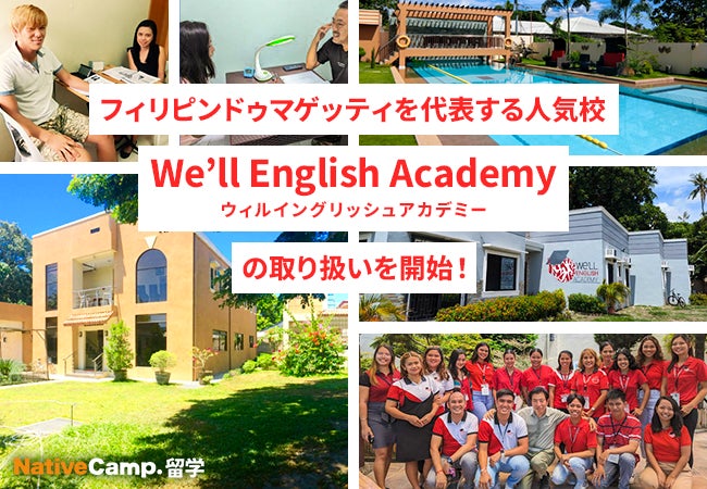 ネイティブスピーカーと回数無制限のオンライン英会話サービス「ネイティブキャンプ英会話」を展開する株式会社ネイティブキャンプ(東京都渋谷区 代表取締役: 谷川国洋)は海外留学エージェントサービス「ネイティブキャンプ留学」において、フィリピン・ドゥマゲッティを代表する人気校「We’ll English Academy(ウィルイングリッシュアカデミー)」の取り扱いを開始したことをお知らせいたします。