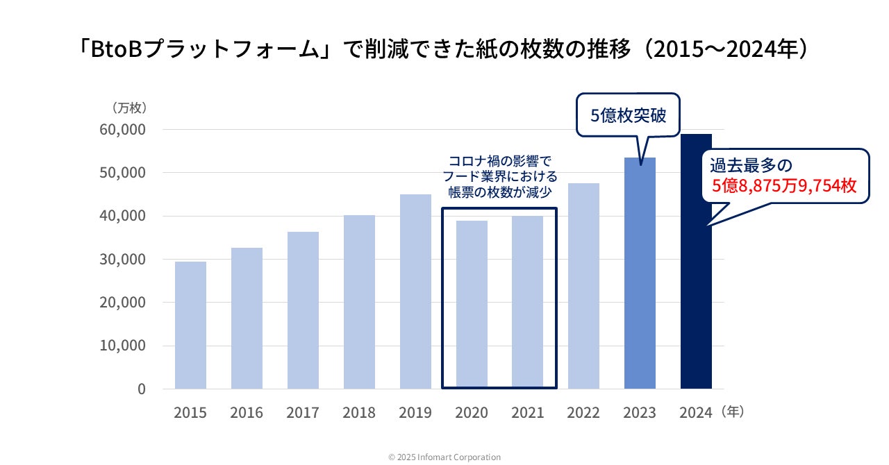 2024年1月〜12月の1年間で「BtoBプラットフォーム」を通じて削減できた紙の枚数は、過去最多の5億8,875万9,754枚(※1)にのぼり、前年度比で約5,461万枚、約10%増加しました。削減枚数は、コロナ禍であった2020~21年を除き、年々増加しています。