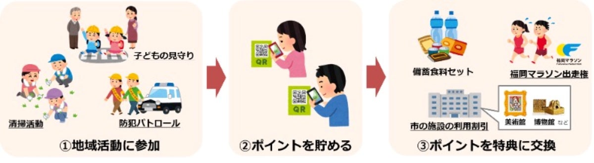 福岡市内の各小学校区の自治協議会が取り組む地域活動の中から、各校区で決定した地域活動の参加者に対し、スマートフォンのアプリ「ふくおかポイント」を通じてポイントを付与します。「ポイ活」のように地域活動への参加でポイントを貯めて、そのポイントで市が提供する嬉しい特典と交換ができる仕組みです。