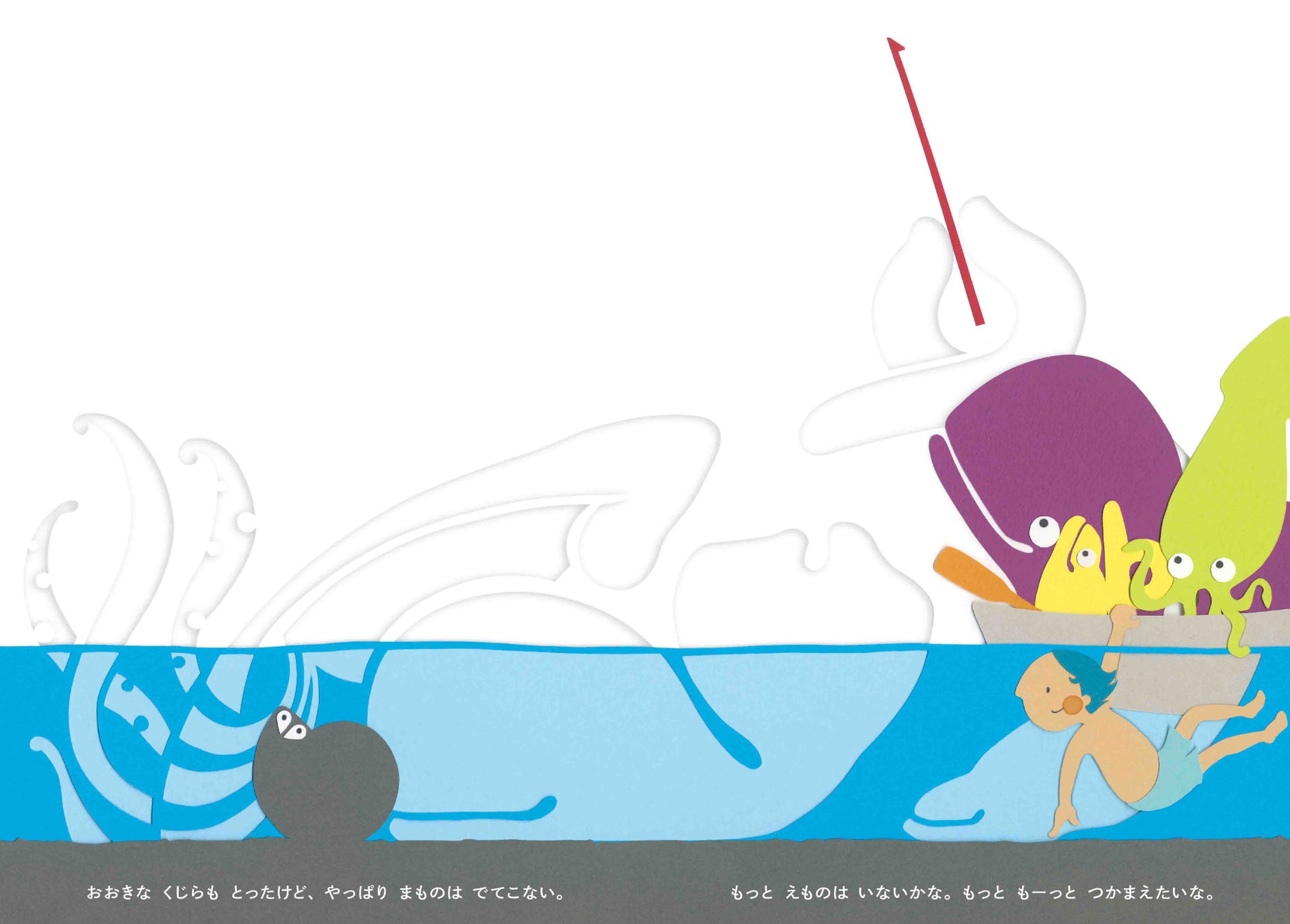 男の子は、ひとり、舟に乗って、ばんごはんをとりにいきました。きょうは、なにがとれるかな…。