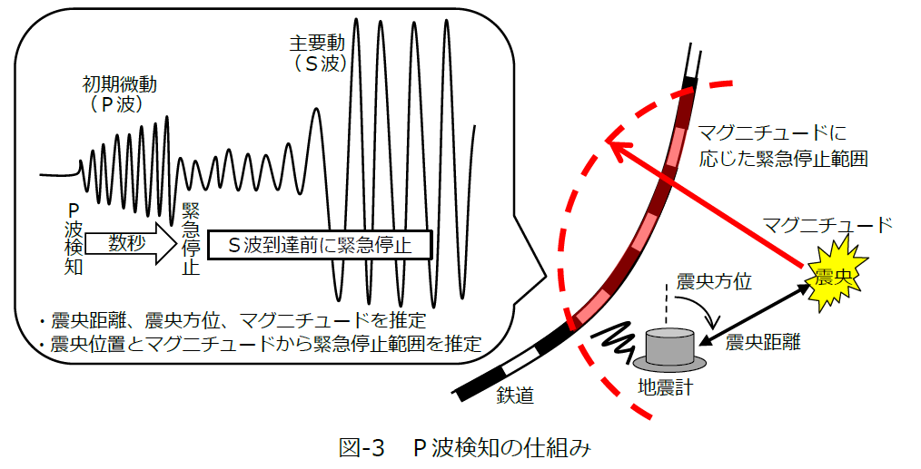 S波検知では、S波の振幅から列車を緊急停止させる仕組みとしていますが、S波よりも早く伝播するP波による検知方法は、観測したP波から地震諸元(震央距離、震央方位、地震規模(以下、マグニチュード))を推定し、推定したマグニチュードに応じた緊急停止範囲の新幹線をS波到達前に緊急停止させる仕組みとしています(図-3)。
