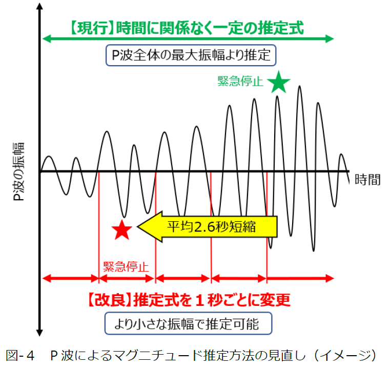 マグニチュードはP波の振幅の大きさに比例することが知られていますが、P波全体でもその振幅は時々刻々と変化するために、1秒ごとにマグニチュードを推定しています。P波の振幅は時間とともに大きくなるのが一般的ですが、これまで推定式の係数は時間に関係なく一定としていました。今回、推定式の係数を1秒ごとの時間とともに変化させることにより、P波検知1秒後から4秒後の推定精度が今までよりも改善し、実際のマグニチュードにより近い値を、より早く推定することが可能となりました(図-4)。