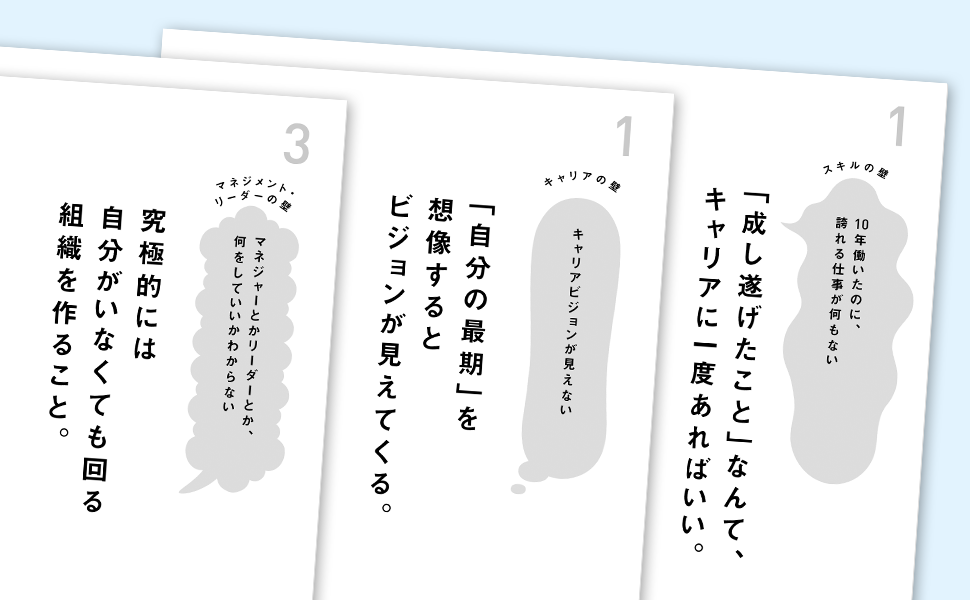 「スキルの壁」、「キャリアの壁」、「職場環境の壁」、「マネジメント・リーダーの壁」、「時代の変化の壁」という5つの章立てで、50項目の悩みに対して答えています。