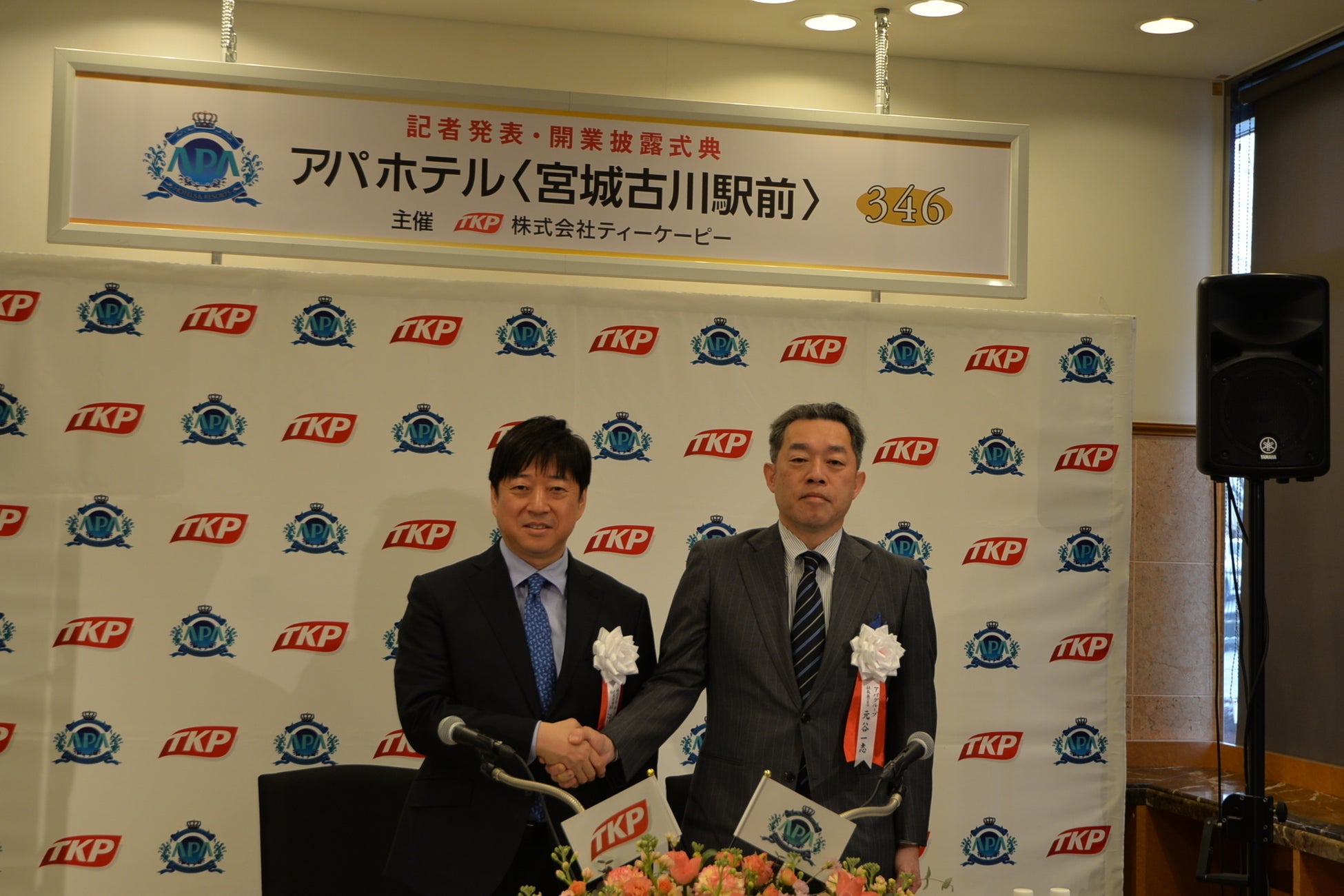 披露式典に先立ち行われた記者発表にて、アパグループ社長 兼 最高経営責任者(CEO)の元谷 一志は「2021年に直営出店したアパホテル〈宮城古川駅前〉をこの度フランチャイズへと転換を行い、株式会社ティーケーピー様として17棟目のアパホテルとなった。直営ホテルから株式会社ティーケーピー様への転換は昨年の帯広、函館、和歌山に続いて4棟目となり、今後も共存共栄を図っていきたい。2024年11月期アパグループ連結決算では、売上高2,260億円、経常利益796億円、経常利益率35.2%と2期連続で過去最高売上、過去最高利益を更新した。2025年11月期については、訪日外国人の増加や大阪・関西万博の開催により、増収増益を予想している。現在当社は130,094室のホテルネットワークを誇り、2027年3月末150,000室達成にむけて取り組んでいきたい。」と述べた。
