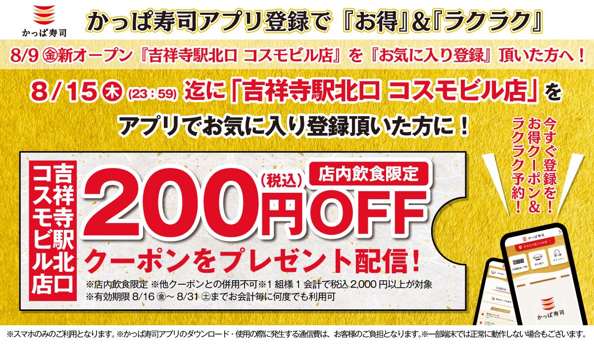 公式アプリ(https://www.kappasushi.jp/app.html)をダウンロード&会員登録いただき、8月1日(木)から8月15日(木)までに『吉祥寺駅北口 コスモビル店』をお気に入り登録いただくと8月16日(金)から8月31日(土)まで、お会計毎に何度でもご利用いただける“店内飲食限定200円(税込)OFFクーポン”をプレゼント配信いたします。
