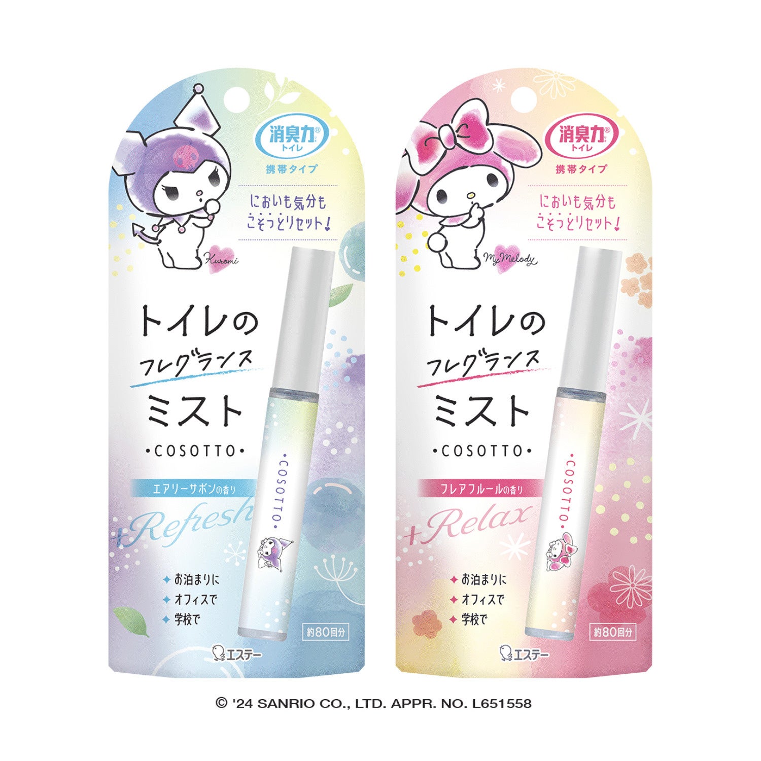 外出先のトイレで気になるにおいをこそっと消臭できるミストタイプのスプレー。「クロミ」、「マイメロディ」を起用したデザインに一新してリニューアル発売。