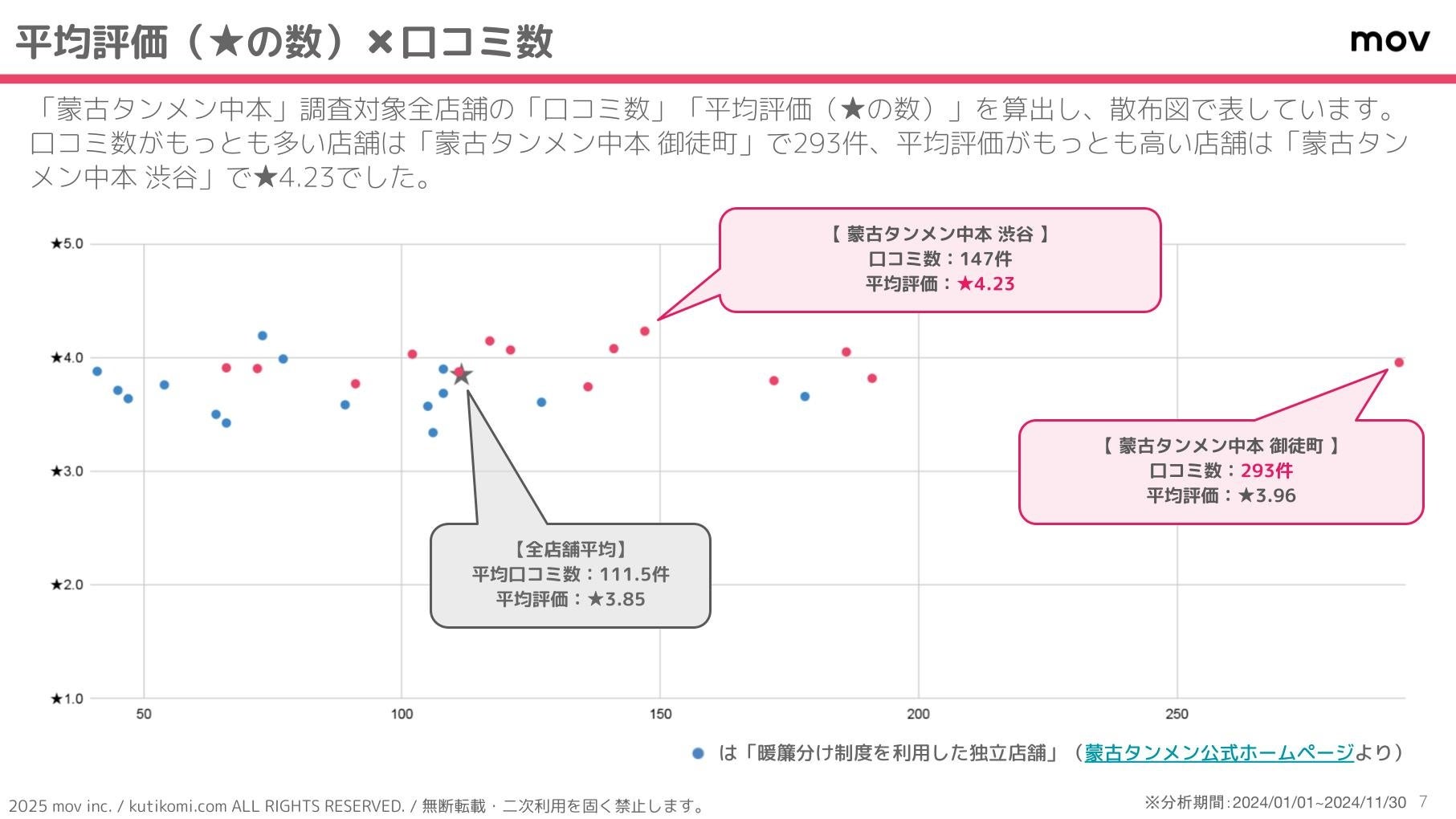 こちらの散布図では、「蒙古タンメン中本」調査対象全店舗の「口コミ数」「平均評価(★の数)」を算出しています。口コミ数がもっとも多い店舗は「蒙古タンメン中本 御徒町」で293件、平均評価がもっとも高い店舗は「蒙古タンメン中本 渋谷」で★4.23でした。
