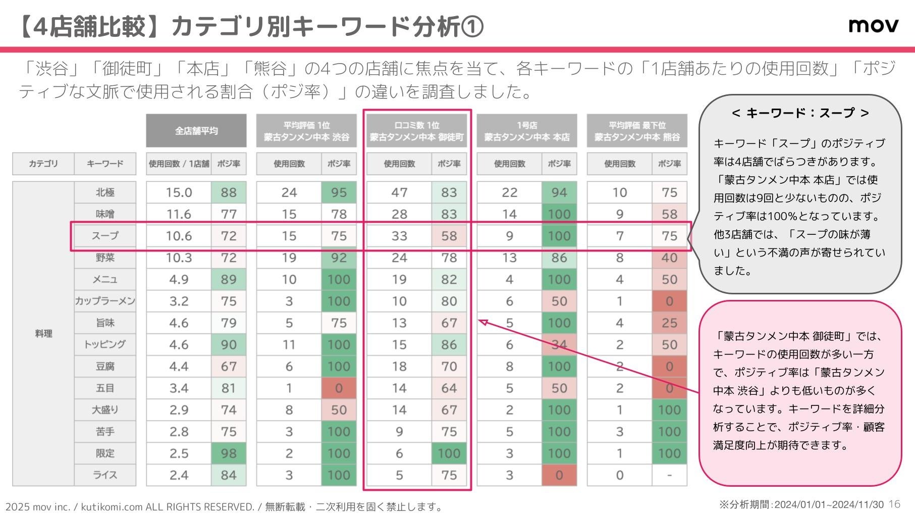 こちらの表では、「蒙古タンメン中本」の口コミにおけるキーワードの「使用回数」「ポジティブな文脈で使用されている割合(ポジティブ率)」を算出し、「使用回数」「ポジティブ率」「ネガティブ率」ごとにランキング形式で分析しています。