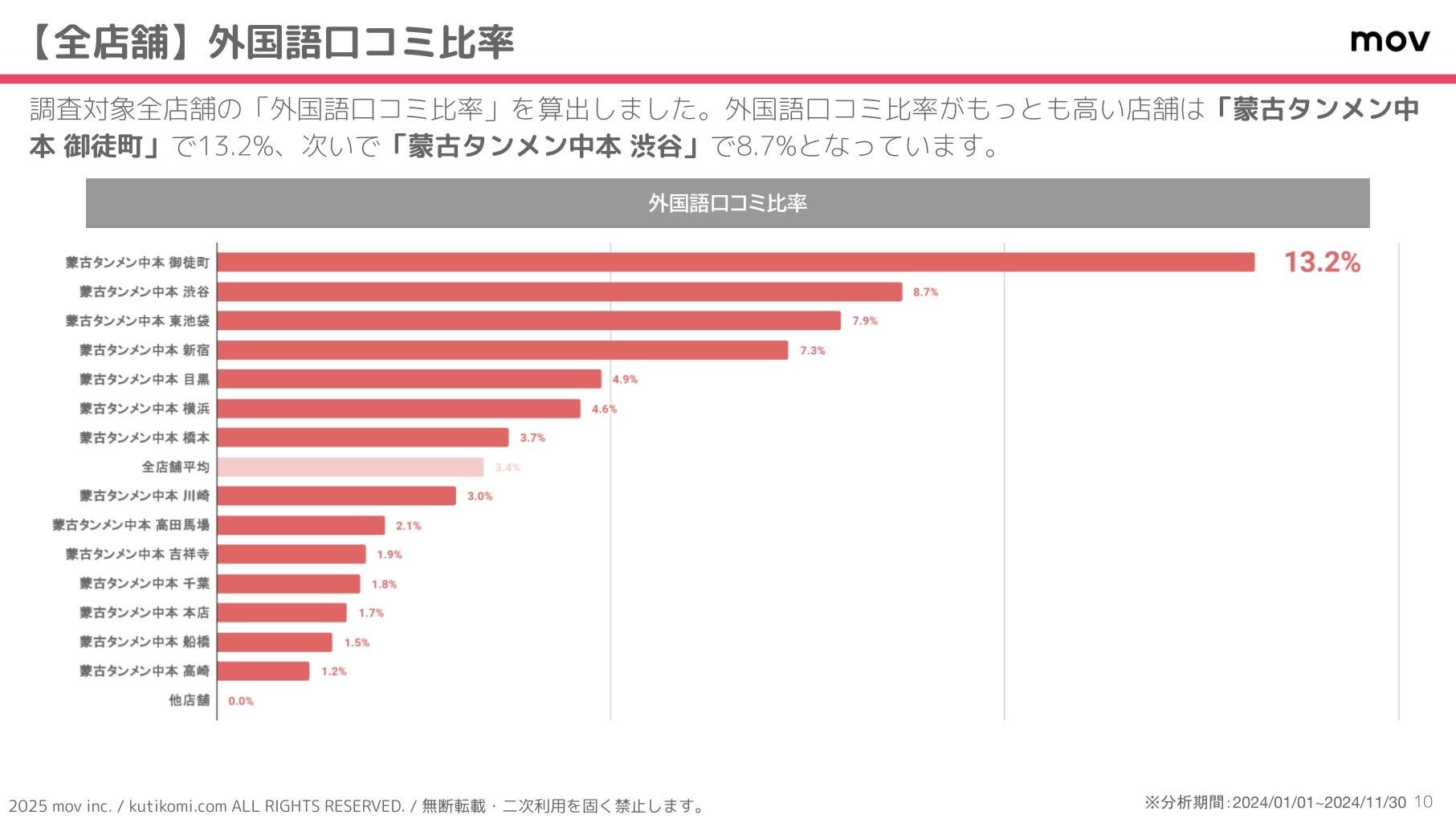 こちらのグラフでは、調査対象全店舗の「外国語口コミ比率」を算出しています。外国語口コミ比率がもっとも高い店舗は「蒙古タンメン中本 御徒町」で13.2%、次いで「蒙古タンメン中本 渋谷」で8.7%となっています。