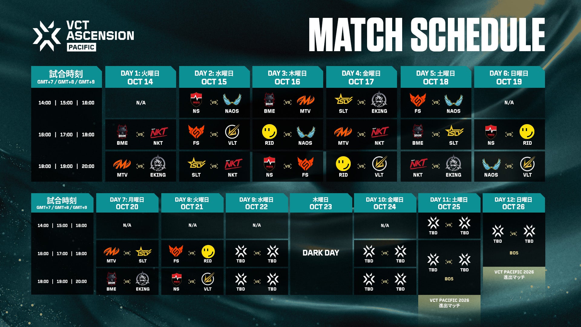 試合の日程は変更される場合がありますので、valorantesports.com にて最新情報をご確認ください。