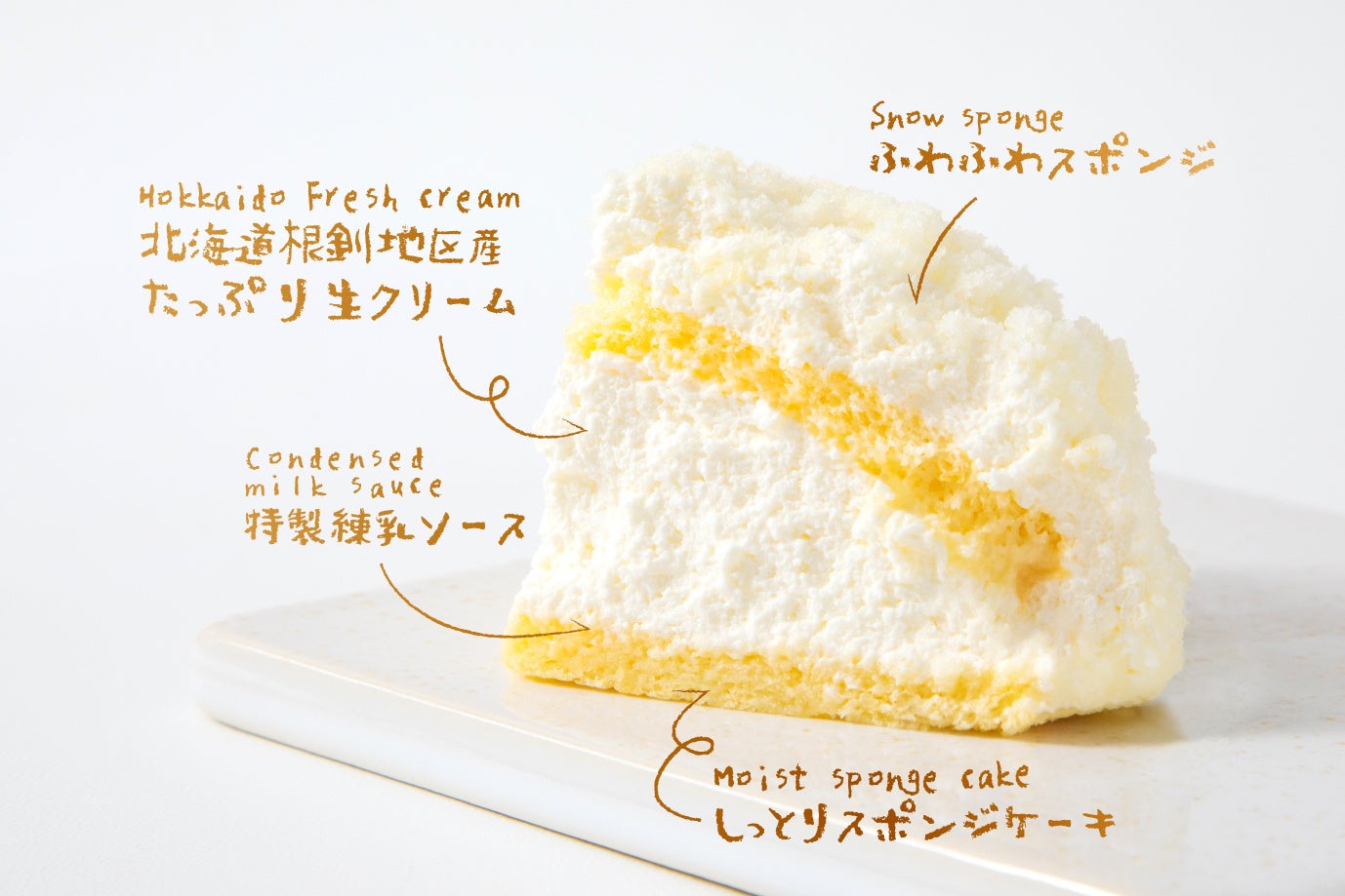 生クリームのミルキーさを楽しんでいただくために、ふわふわのスポンジ部分にミルクの美味しさが凝縮した「練乳ミルクソース」を1層加えております。