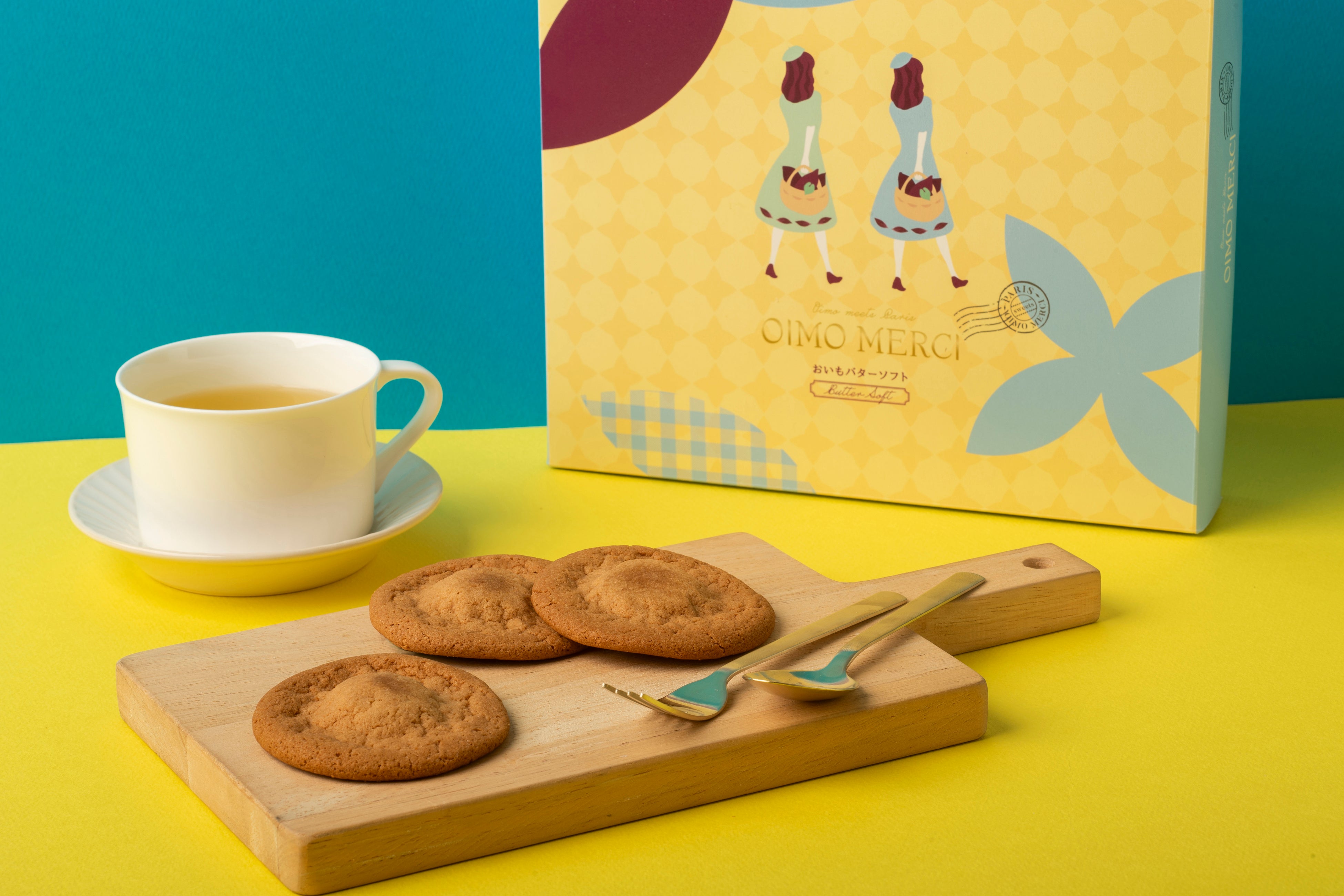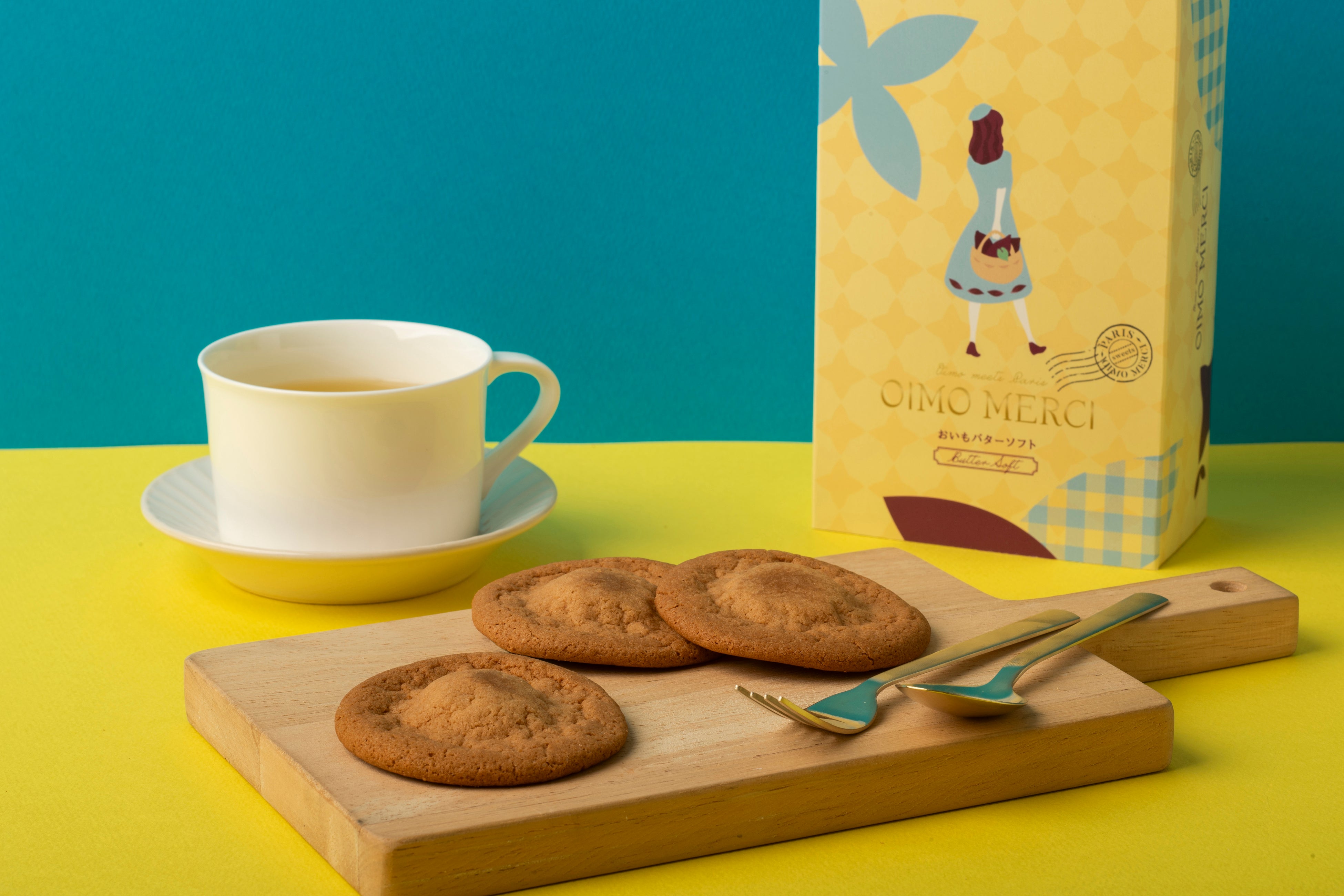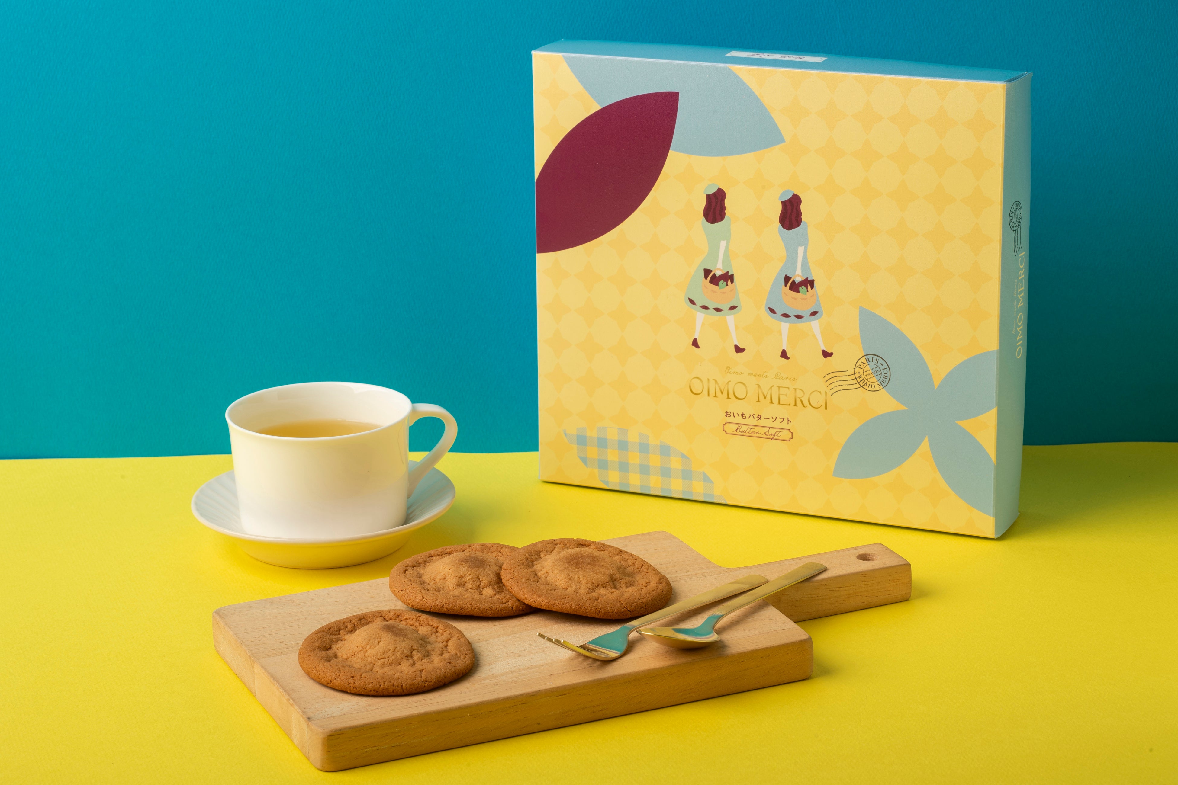 OIMO MERCIは商品ごとに、パリ仕立てのおいもスイーツになるまでの小さな物語が綴られたカードが添えられています。おいもバターソフトでは、フランス・パリの街角で香る、芳醇なバターと出会ったおいもの女の子メルシーの物語が綴られています。