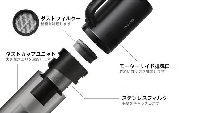 そして、H12 Dualのダストカップには、複数のフィルターシステムがあり、排出される空気が二次汚染を引き起こさないように確保されています。ゴミやホコリが吸い込まれた後、サイクロン分離フィルターシステムを通過し、ステンレスフィルター、ダストボックス、ダストフィルターによって大粒のごみ、髪の毛のかけら、微粒子のほこりが分離され、最終的にモーターの両側からきれいな空気が排出されます。