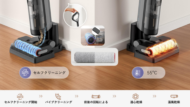 ④「双方向回転式モップ自動洗浄システムを搭載、55℃熱風乾燥※」
