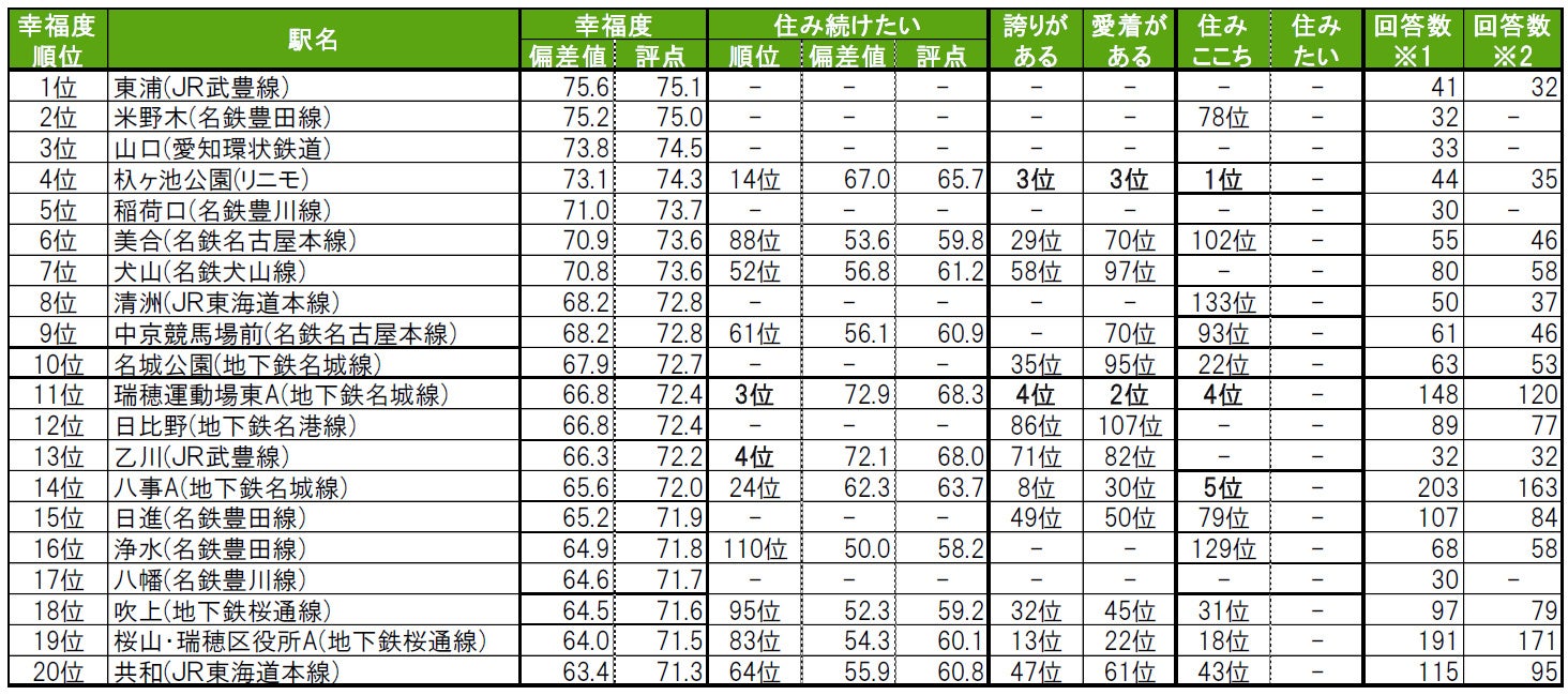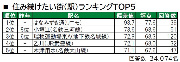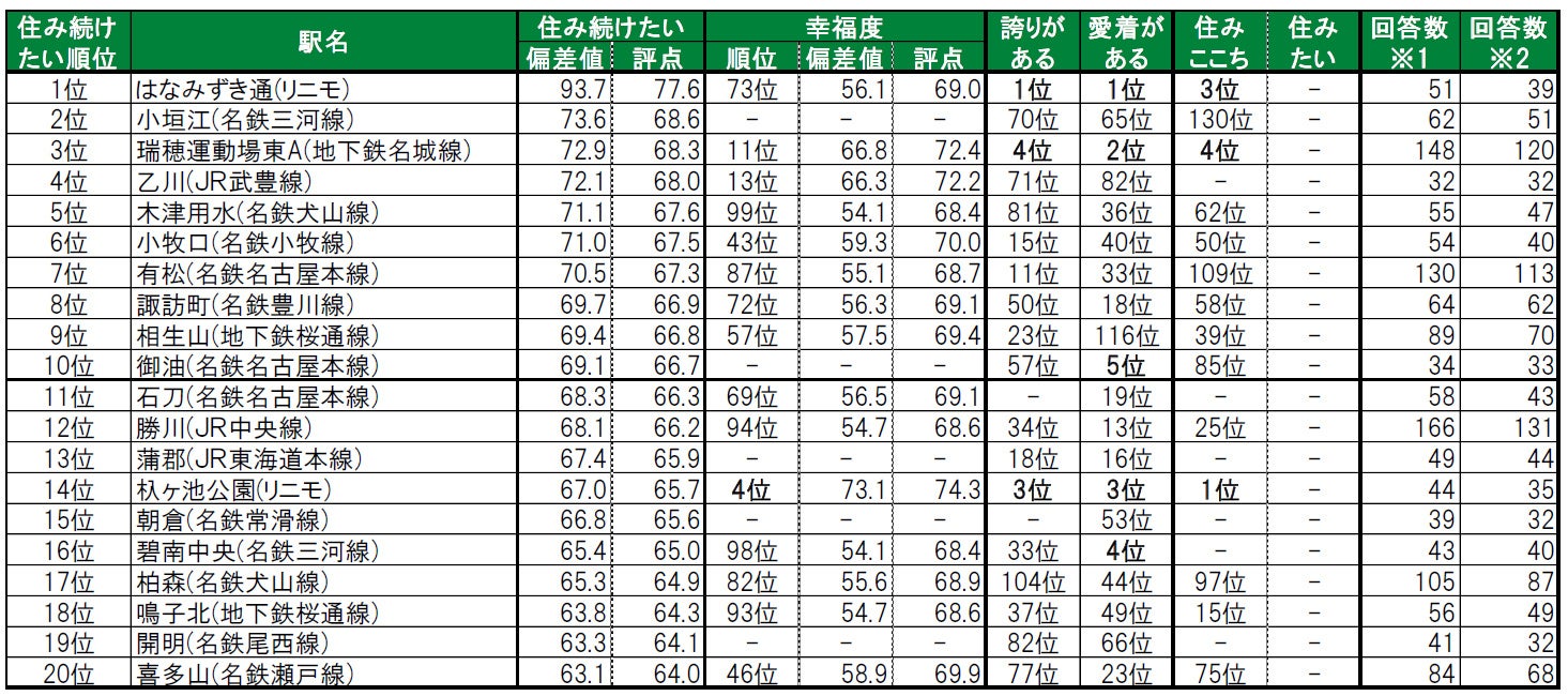 1位は長久手市にあるはなみずき通で、昨年は累計回答数が30名未満だったためランキング集計対象外でしたが、「街に誇りがある(駅)」「街に愛着がある(駅)」でも1位、「住みここち(駅)」では3位と評価の高い駅です。2位は小垣江で、刈谷市にある名鉄三河線の駅です。3位は名古屋市瑞穂区にある瑞穂運動場東Aで、「街に愛着がある(駅)」2位、「住みここち(駅)」「街に誇りがある(駅)」では4位となっています。