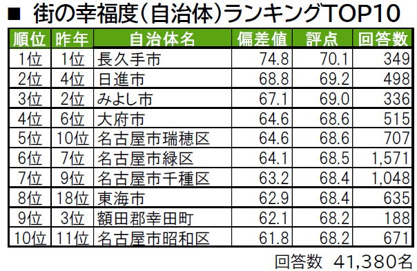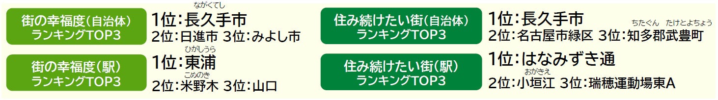 1位は2年連続で長久手市で、「街の幸福度(自治体)」「住みここち(自治体)」「街に誇りがある(自治体)」「街に愛着がある(自治体)」でも全て1位、「住みたい街(自治体)」では4位と全てのランキングでトップ5以内に入っています。2位も2年連続で名古屋市緑区で、「街に愛着がある(自治体)」3位、「街に誇りがある(自治体)」4位となっている街です。3位も2年連続で知多郡武豊町で、トップ3は昨年と全く同じランキング結果となっています。