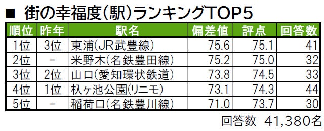 1位は知多郡東浦町にあり、名古屋駅まで直通で行くことが出来る東浦です。2位は日進市にある米野木で、昨年は累計回答数が30名未満だったためランキング集計対象外だった駅です。3位は瀬戸市にある山口です。