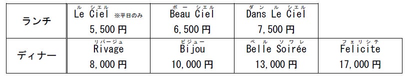 販売価格 各コースはランチ3種類、ディナー4種類をご用意しております。(おひとり様あたり/ 税サ込)