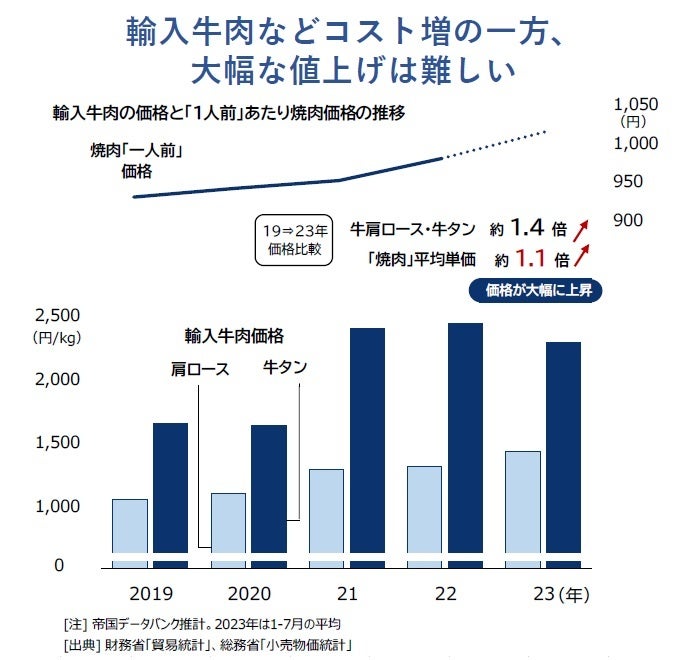 一方で、店内オペレーションが比較的簡単といった特徴から、焼肉人気に着目した居酒屋やラーメンチェーンなど異業種の参入が相次いだほか、既存大手の新規出店も重なり競争が激化した。加えて、輸送コストの増加や円安の影響により、安価な米国や豪州産などの輸入牛肉価格が高騰したほか、電気・ガス代、アルバイトといった人件費など運営コストの上昇も重なった。他方、物価高騰による消費者の「値上げ疲れ」も背景に大幅なメニューの値上げが難しく、不採算店舗の撤退などに動くケース出始めた。こうした経営環境の悪化で、小規模な焼肉店などでは厳しい価格競争に耐え切れなくなり、淘汰される中小焼肉店が増えている。