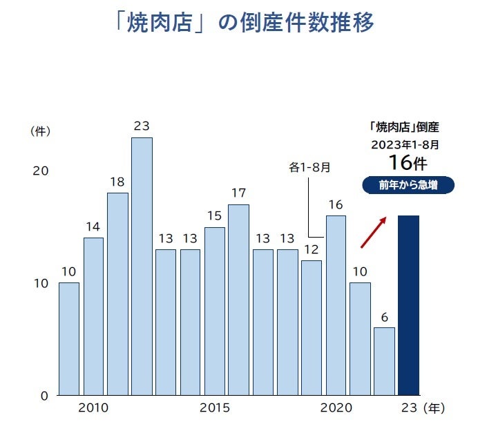 コロナ禍の外食産業で「勝ち組」とされた焼肉店で倒産が急増している。2023年に発生した「焼肉店」の倒産は、8月までに16件発生した。22年の同期間に比べ約3倍に達したほか、1-8月の累計としては過去10年間で最多ペースに迫り、急増ぶりが鮮明となっている。