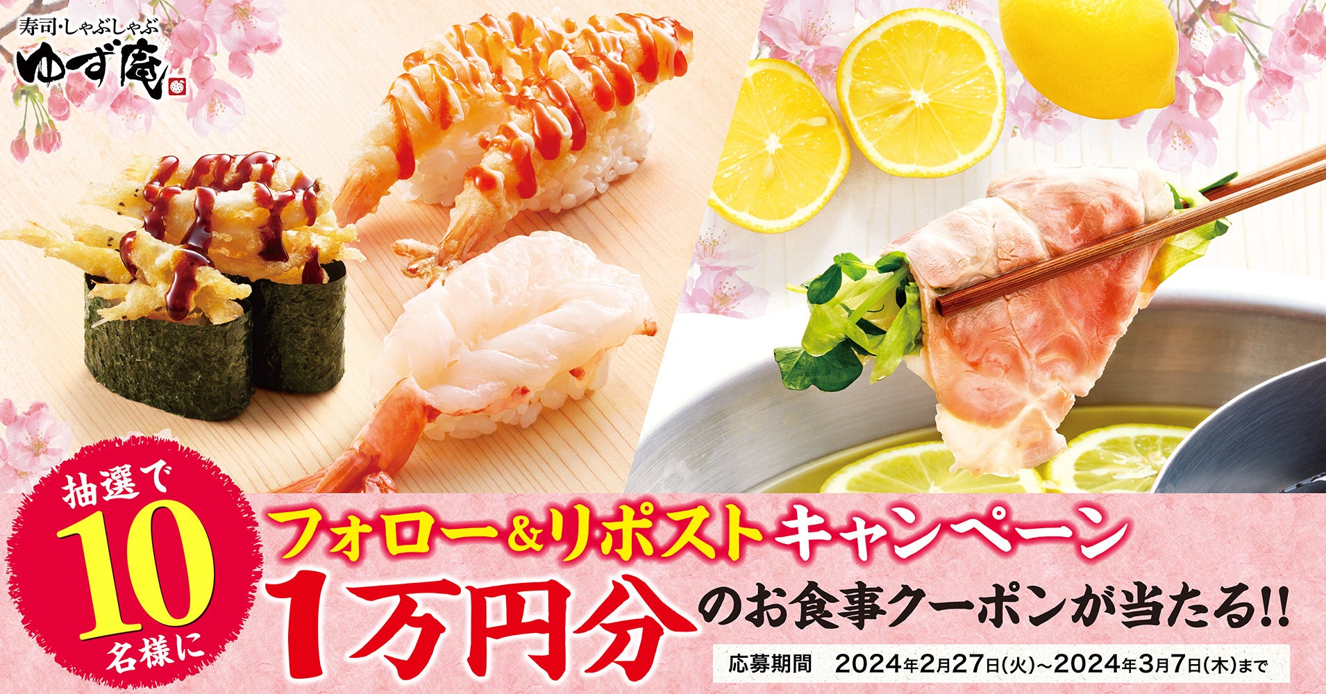 株式会社物語コーポレーション(本社:愛知県豊橋市/代表取締役社長:加藤 央之)が全国95店舗展開する『寿司・しゃぶしゃぶ ゆず庵』(以下、ゆず庵)は、春期間限定メニューの販売を記念して、公式X(旧Twitter)にてゆず庵アプリクーポン10,000円分が当たるプレゼントキャンペーンを開催いたします。