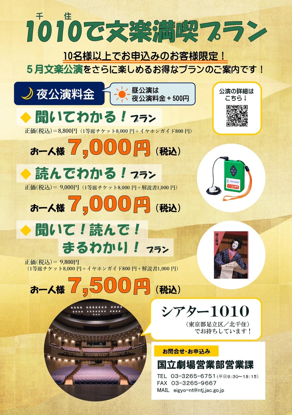 特別プランのお申し込みは、国立劇場営業課にお願いいたします。インターネット購入、電話購入での受付はございません。