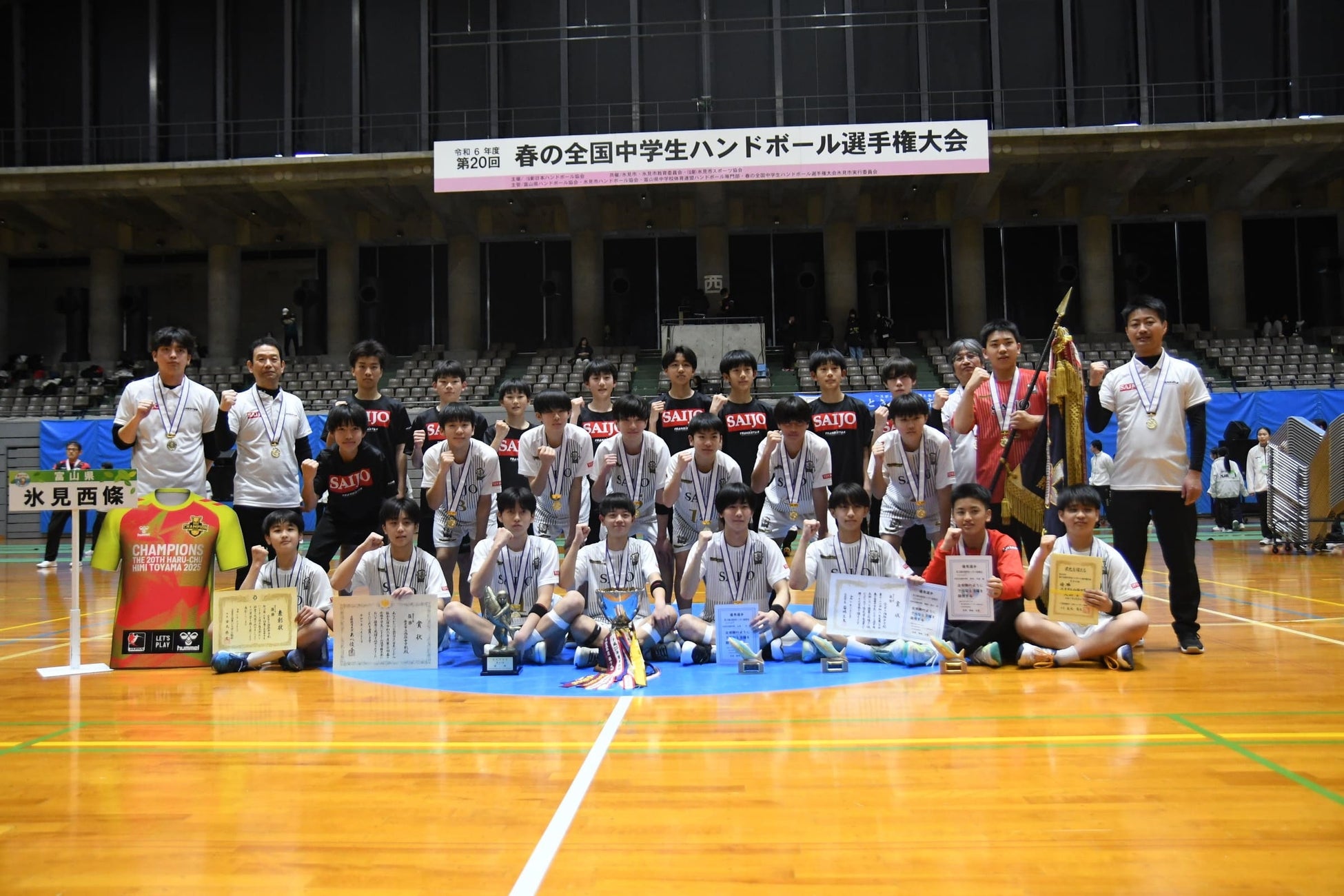 大会は、男女いずれも46都道府県から48チームが日本一を争い、女子は熊本県の宇都市立鶴城中が初優勝。男子は地元の富山県氷見市立西條中が2年連続3目の日本一に輝いた。地元での大会となった西條中は、300名を超える大応援団の声援を受け、ラスト5秒のゴールで群馬県代表のGHRに勝利。地元チームの連覇という熱狂に包まれて春中ハンドは幕を閉じた。