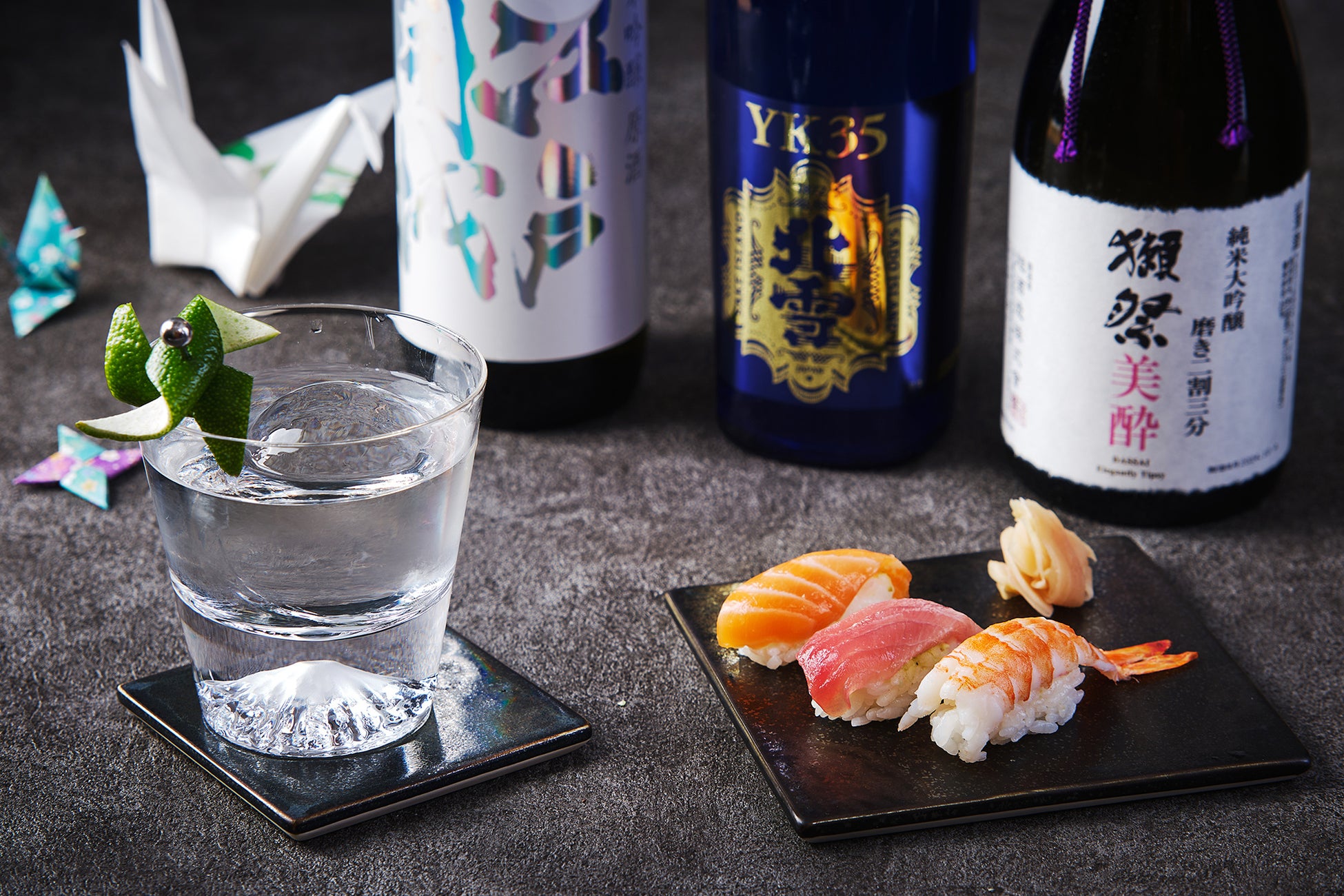 寿司は、選りすぐりのまぐろ、サーモン、エビの3貫を繊細な技で丁寧に仕上げて提供いたします。日本酒は、国内外で高い評価を受けている山口の銘酒「獺祭 純米大吟醸 磨き二割三分 美酔」、新潟の伝統的な長期低温発酵で醸し出された「北雪 大吟醸 YK35」、そして2011年に東京港区芝に百年の時を経て蘇った酒蔵より「江戸開城 純米吟醸」の3種をラインナップ。お好みの1杯をお選びいただき、冷たさとのど越しの心地よさ、そしてお米の豊かな風味が感じられるロックスタイルでご用意いたします。