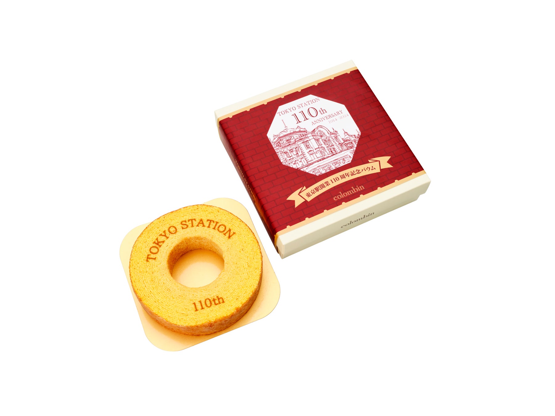 平飼い鶏が産む新鮮卵と、渋谷コロンバンビル屋上で養蜂した蜜を使用した「原宿はちみつ」、オーガニックシュガー、フランス産ディロンラムなど厳選素材を使い丁寧に焼き上げた、しっとりふんわり食感のバウムクーヘンです。バウムクーヘンには焼き印、パッケージには東京駅開業110周年アニバーサリーのデザインをあしらった今だけの特別な商品です。